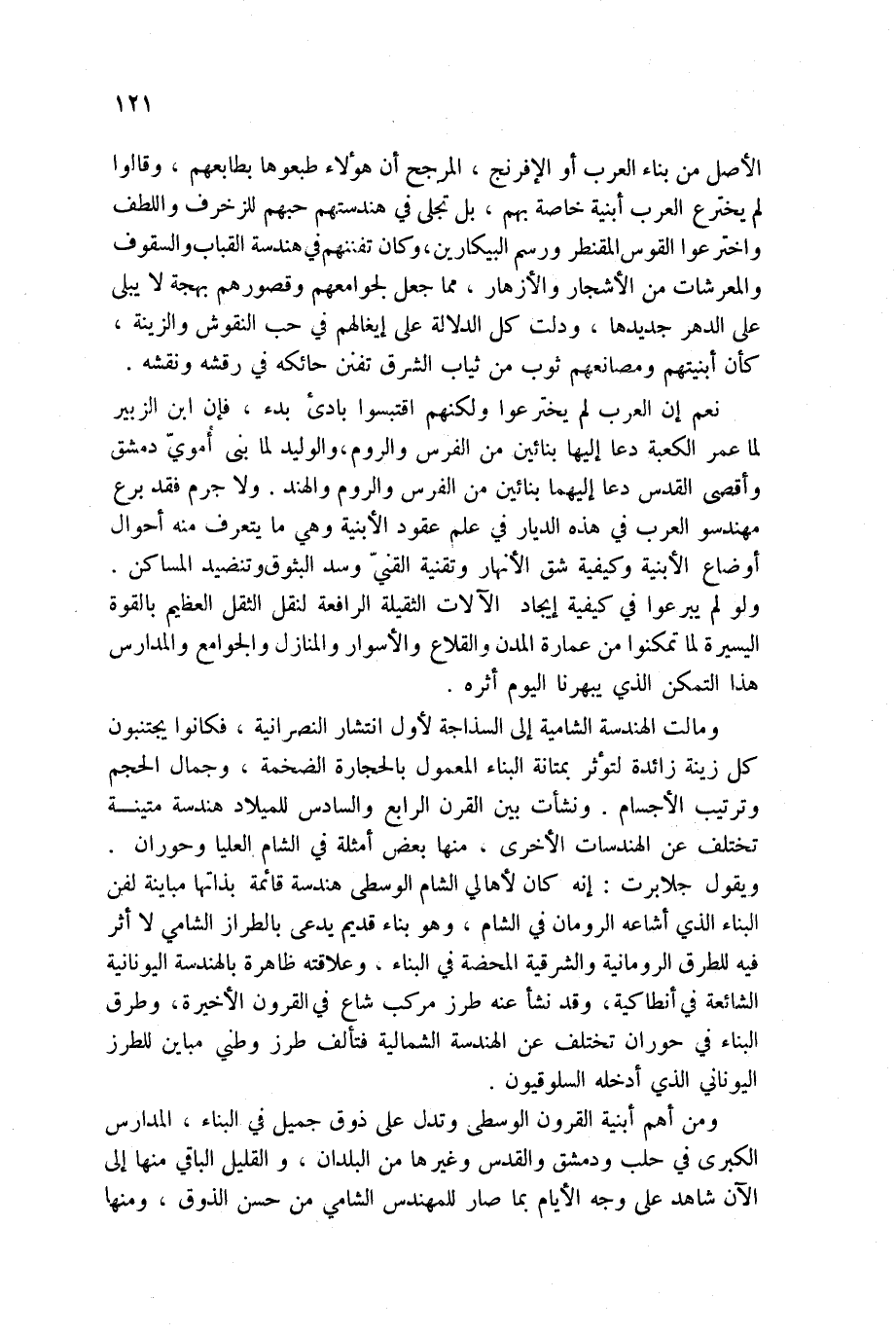 نعم إن العرب لم يخترعوا ولكنهم اقتبسوا بادئ بدء، فإن ابن الزبير لما عمر الكعبة دعا إليها بنائين من الفرس والروم، والوليد لما بنى أُمويّ دمشق وأقصى القدس دعا إليهما بنائين من الفرس والروم والهند. ولا جرم فقد برع مهندسو العرب في هذه الديار في علم عقود الأبنية وهي ما يتعرف منه أحوال أوضاع