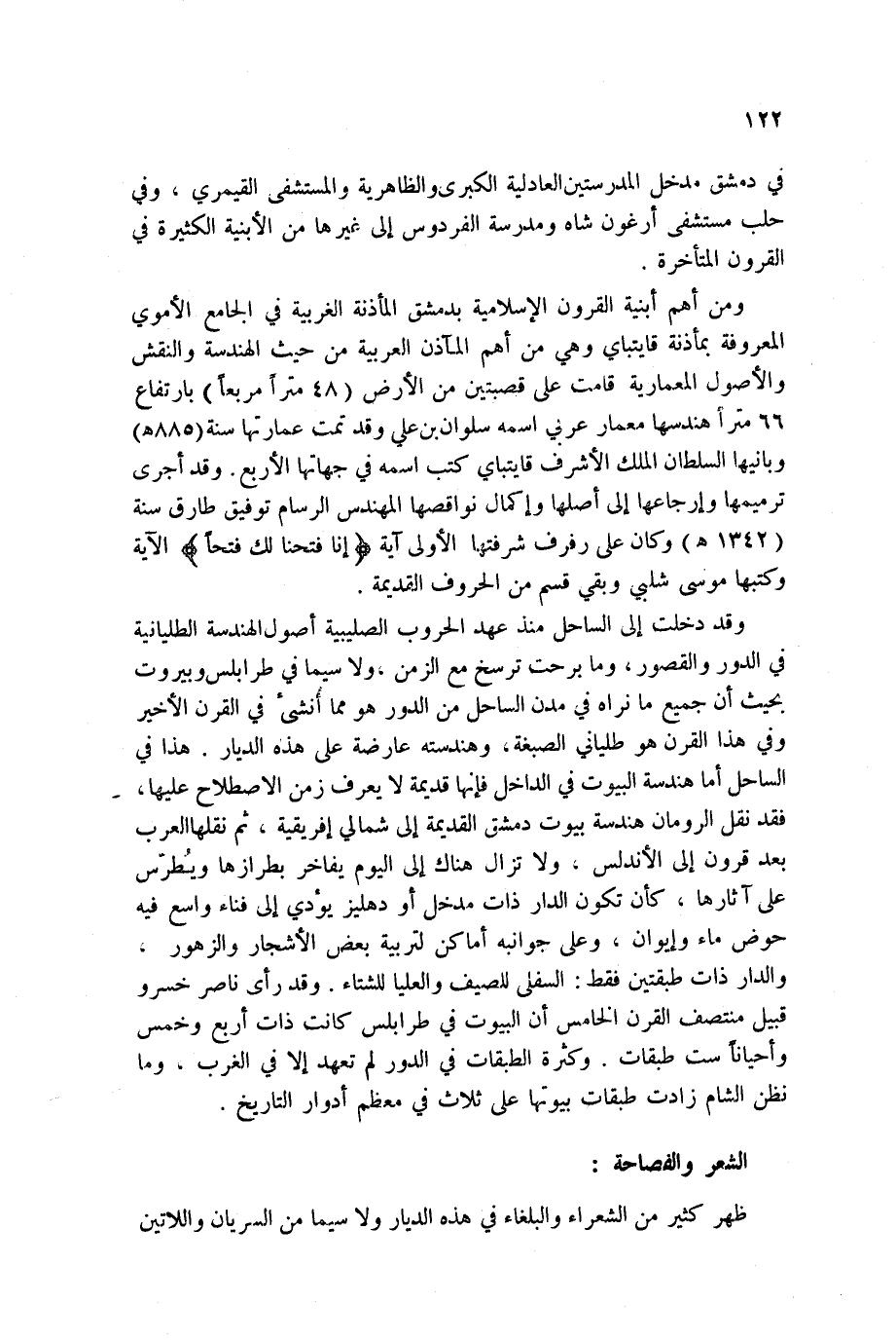 وقد دخلت إلى الساحل منذ عهد الحروب الصليبية أصول الهندسة الطليانية في الدور والقصور، وما برحت ترسخ مع الزمن، ولا سيما في طرابلس وبيروت بحيث أن جميع ما نراه في مدن الساحل من الدور هو مما أُنشئ في القرن الأخير وفي هذا القرن هو طلياني الصبغة، وهندسته عارضة على هذه الديار. هذا في الساحل أما هندسة البيوت في الداخل فإنها قديمة لا يعرف زمن الاصطلاح عليها، فقد نقل الرومان هندسة بيوت دمشق القديمة إلى شمالي أفريقية، ثم نقلها العرب بعد قرون إلى الأندلس، ولا تزال هناك إلى اليوم يفاخر بطرازها ويُطرّس على آثارها، كأن تكون الدار ذات مدخل أو دهليز يؤدي إلى فناء واسع فيه حوض ماء وإيوان، وعلى جوانبه أماكن لتربية بعض الأشجار والزهور، والدار ذات طبقتين فقط: السفلى للصيف والعليا للشتاء. وقد رأى ناصر خسرو قبيل منتصف القرن الخامس أن البيوت في طرابلس كانت ذات أربع وخمس وأحياناً ست طبقات. وكثرة الطبقات في الدور لم تعهد إلا في الغرب، وما نظن الشام زادت طبقات بيوتها على ثلاث في معظم أدوار التاريخ.