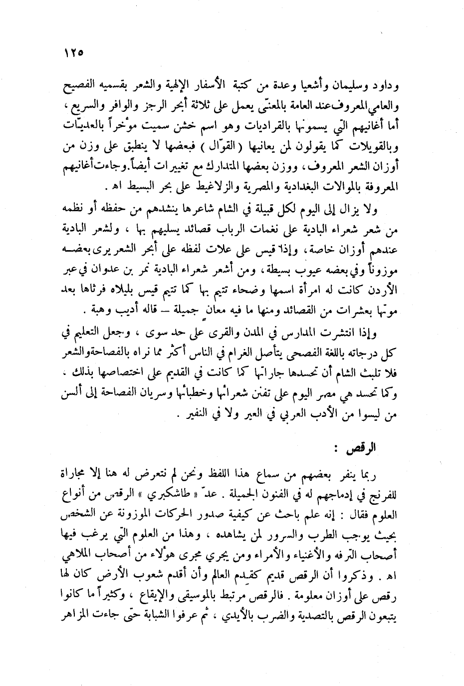 ربما ينفر بعضهم من سماع هذا اللفظ ونحن لم نتعرض له هنا إلا مجاراة للفرنج في إدماجهم له في الفنون الجميلة. عدّ طاشكبري الرقص من أنواع العلوم فقال: إنه علم باحث عن كيفية صدور الحركات الموزونة عن الشخص بحيث يوجب الطرب والسرور لمن يشاهده، وهذا من العلوم التي يرغب فيها أصحاب الترفه والأغنياء والأمراء ومن يجري مجرى هؤلاء من أصحاب الملاهي اه. وذكروا أن الرقص قديم كقِدم العالم وأن أقدم شعوب الأرض كان لها رقص على أوزان معلومة. فالرقص مرتبط بالموسيقى والإيقاع، وكثيراً ما كانوا يتبعون الرقص بالتصدية والضرب بالأيدي، ثم عرفوا الشبابة حتى جاءت المزاهر