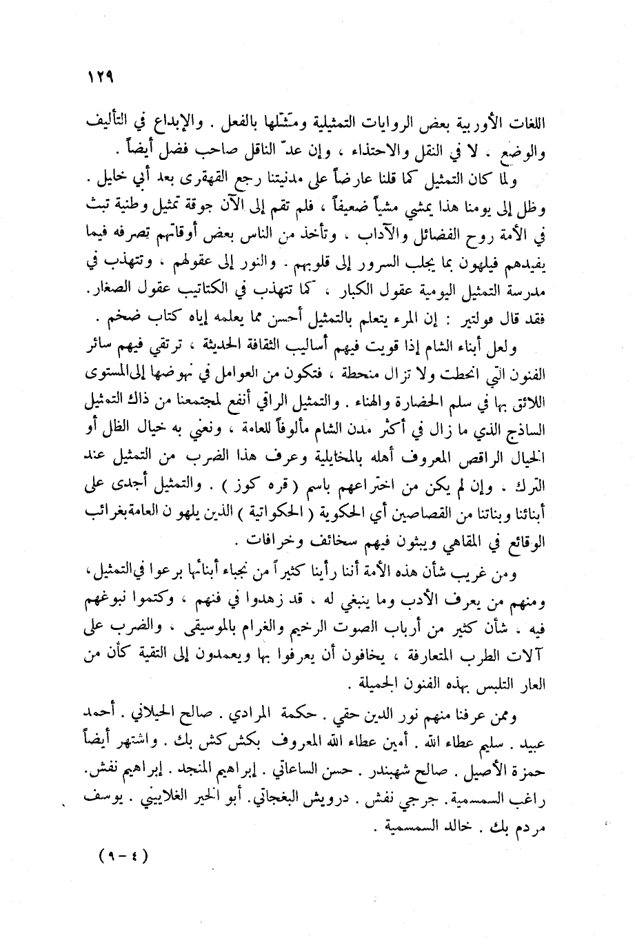 ولعل أبناء الشام إذا قويت فيهم أساليب الثقافة الحديثة، ترتقي فيهم سائر الفنون التي انحطت ولا تزال منحطة، فتكون من العوامل في نهوضها إلى المستوى اللائق بها في سلم الحضارة والهناء. والتمثيل الراقي أنفع لمجتمعنا من ذاك التمثيل الساذج الذي ما زال في أكثر مدن الشام مألوفاً للعامة، ونعني به خيال الظل أو الخيال الراقص المعروف أهله بالمخايلية وعرف هذا الضرب من التمثيل عند الترك، وإن لم يكن من اختراعهم باسم قره كوز. والتمثيل أجدى على أبنائنا وبناتنا من القصاصين أي الحكوية الحكواتية الذين يلهون العامة بغرائب الوقائع في المقاهي ويبثون فيهم سخائف وخرافات.