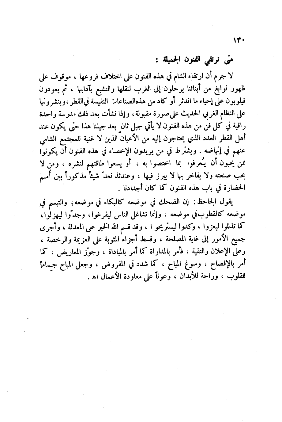 لا جرم أن ارتقاء الشام في هذه الفنون على اختلاف فروعها، موقوف على ظهور نوابغ من أبنائنا يرحلون إلى الغرب لنقلها والتشبع بآدابها، ثم يعودون فيلوبون على إحياء ما اندثر أو كاد من هذه الصناعات النفيسة في القطر، وينشرونها على النظام الغربي الحديث على صورة مقبولة، وإذا نشأت بعد ذلك مدرسة واحدة راقية في كل فن من هذه الفنون لا يأتي جيل ثانٍ بعد جيلنا هذا حتى يكون عند أهل القطر العدد الذي يحتاجون إليه من الأعيان الذين لا غنية للمجتمع الشامي عنهم في إنهاضه. ويشترط في من يريدون الإخصاء في هذه الفنون أن يكونوا ممن يحبون أن يُعرفوا بما اختصوا به، أو يسعوا طاقتهم لنشره، ومن لا يحب صنعته ولا يفاخر بها لا يبرز فيها، وعندئذ نعدّ شيئاً مذكوراً بين أمم الحضارة في باب هذه الفنون كما كان أجدادنا.