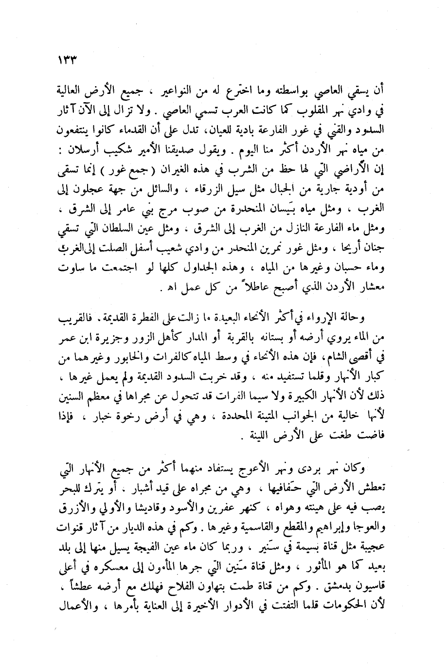 أن يسقي العاصي بواسطته وما اخترع له من النواعير، جميع الأرض العالية في وادي نهر المقلوب كما كانت العرب تسمي العاصي. ولا تزال إلى الآن آثار السدود والقني في غور الفارعة بادية للعيان، تدل على أن القدماء كانوا ينتفعون من مياه نهر الأردن أكثر منا اليوم. ويقول صديقنا الأمير شكيب أرسلان: إن الأراضي التي لها حظ من الشرب في هذه الغيران جمع غور إنما تسقى من أودية جارية من الجبال مثل سيل الزرقاء، والسائل من جهة عجلون إلى الغرب، ومثل مياه بَيسان المنحدرة من صوب مرج بني عامر إلى الشرق، ومثل ماء الفارعة النازل من الغرب إلى الشرق، ومثل عين السلطان التي تسقي جنان أريحا، ومثل غور نمرين المنحدر من وادي شعيب أسفل الصلت إلى الغرب وماء حسبان وغيرها من المياه، وهذه الجداول كلها لو اجتمعت ما ساوت معشار الأردن الذي أصبح عاطلاً من كل عمل اه.