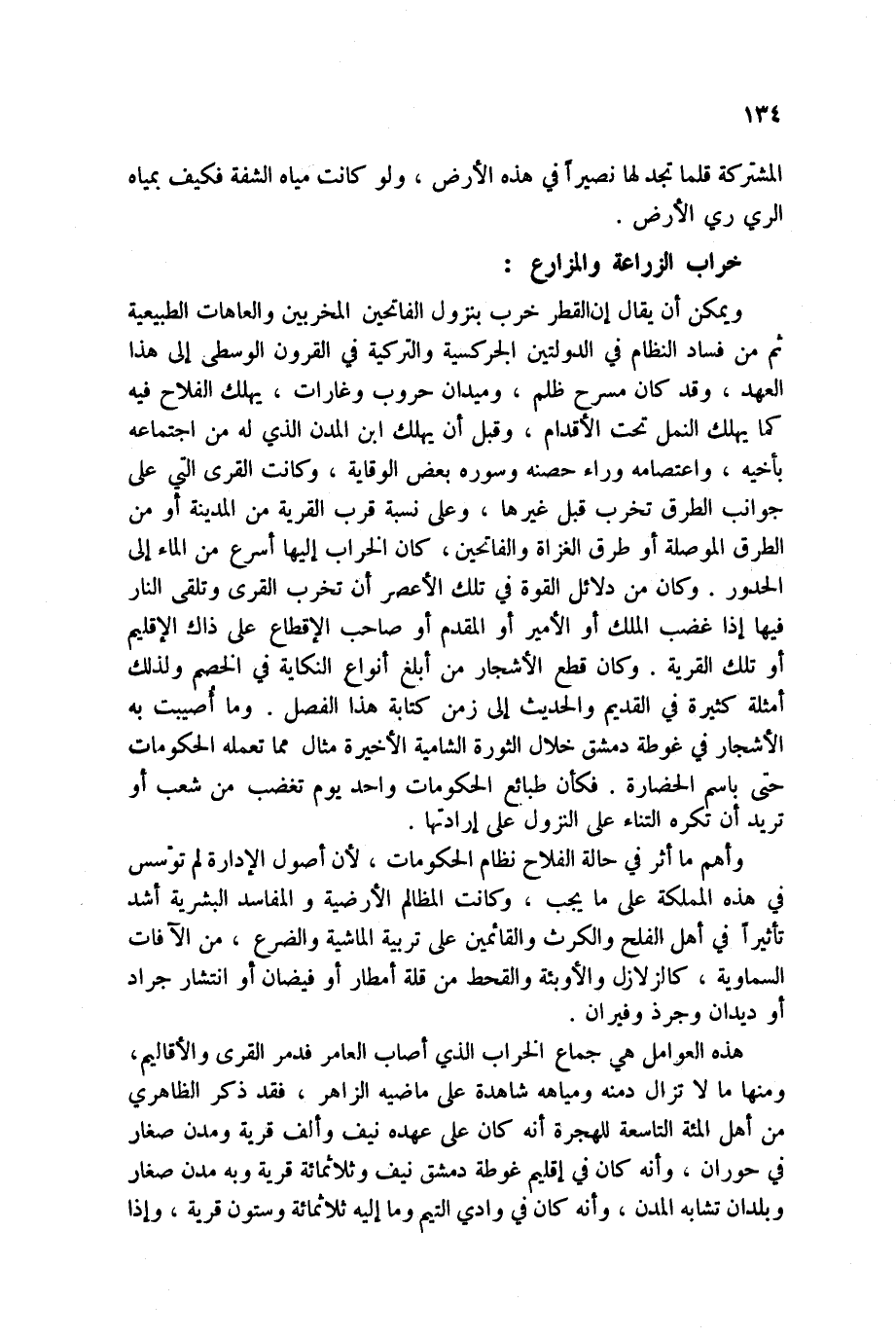 ويمكن أن يقال إن القطر خرب بنزول الفاتحين المخربين والعاهات الطبيعية ثم من فساد النظام في الدولتين الجركسية والتركية في القرون الوسطى إلى هذا العهد، وقد كان مسرح الظلم، وميدان حروب وغارات، يهلك الفلاح فيه كما يهلك النمل تحت القدام، وقبل أن يهلك ابن المدن الذي له من اجتماعه بأخيه، واعتصامه وراء حصنه وسوره بعض الوقاية، وكانت القرى التي على جوانب الطرق تخرب قبل غيرها، وعلى نسبة قرب القرية من المدينة أو من الطرق الموصلة أو طرق الغزاة والفاتحين، كان الخراب إليها أسرع من الماء إلى الحدور. وكان من دلائل القوة في تلك الأعصر أن تخرب القرى وتلقى النار فيها إذا غضب الملك أو الأمير أو المقدم أو صاحب القطاع على ذاك الإقليم أو تلك القرية. وكان قطع الأشجار من أبلغ أنواع النكاية في الخصم ولذلك أمثلة كثيرة في القديم والحديث إلى زمن كتابة هذا الفصل. وما أُصيبت به الشجار في غوطة دمشق خلال الثورة الشامية الأخيرة مثال مما تعمله الحكومات حتى باسم الحضارة. فكأن طبائع الحكومات واحد يوم تغضب من شعب أو نريد أن تكره التناء على النزول على إرادتها.