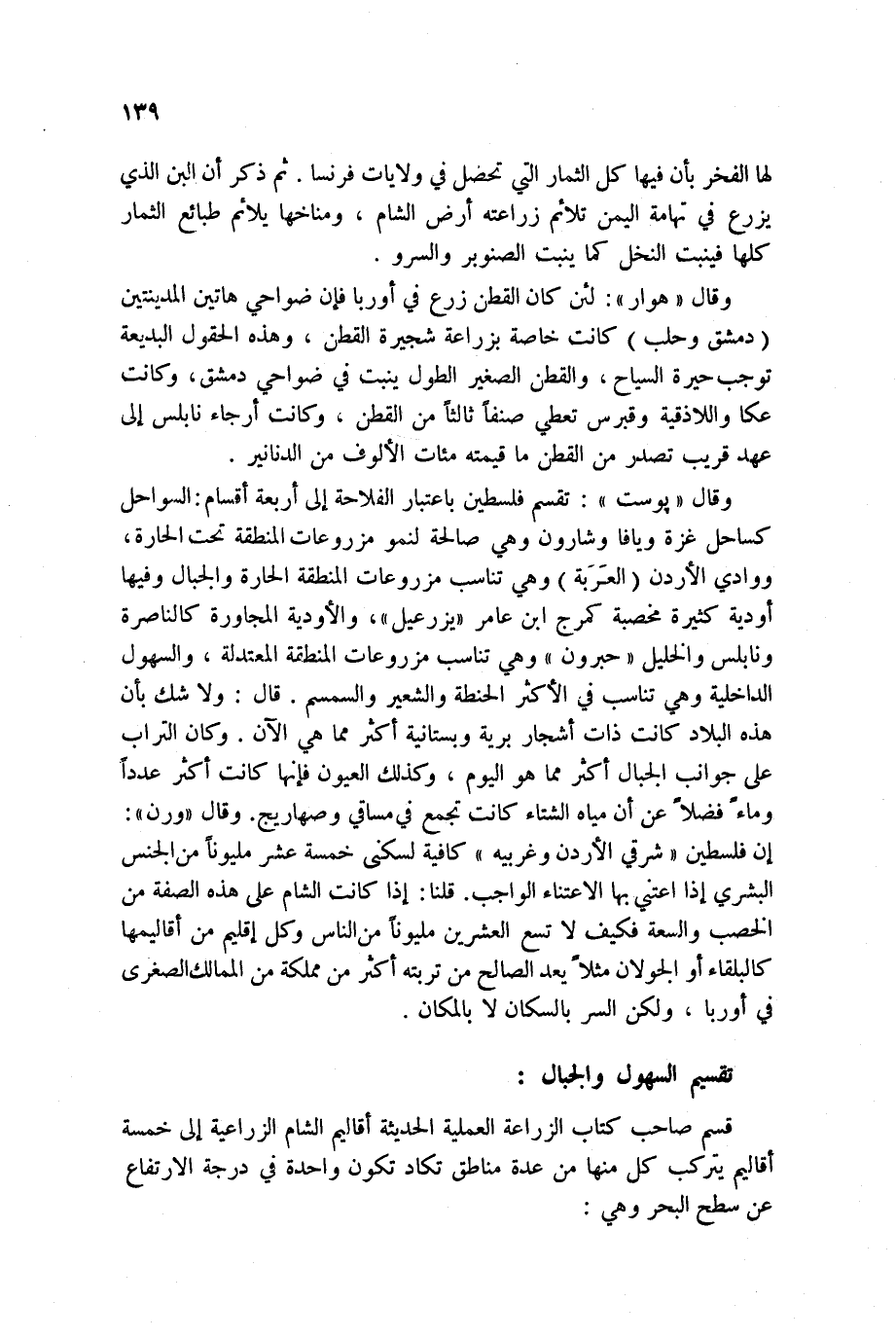 لها الفخر بأن فيها كل الثمار التي تحصل في ولايات فرنسا. ثم ذكر أن البن الذي يزرع في تهامة اليمن تلائم زراعته أرض الشام، ومناخها يلائم طبائع الثمار كلها فينبت النخل كما ينبت الصنوبر والسرو.