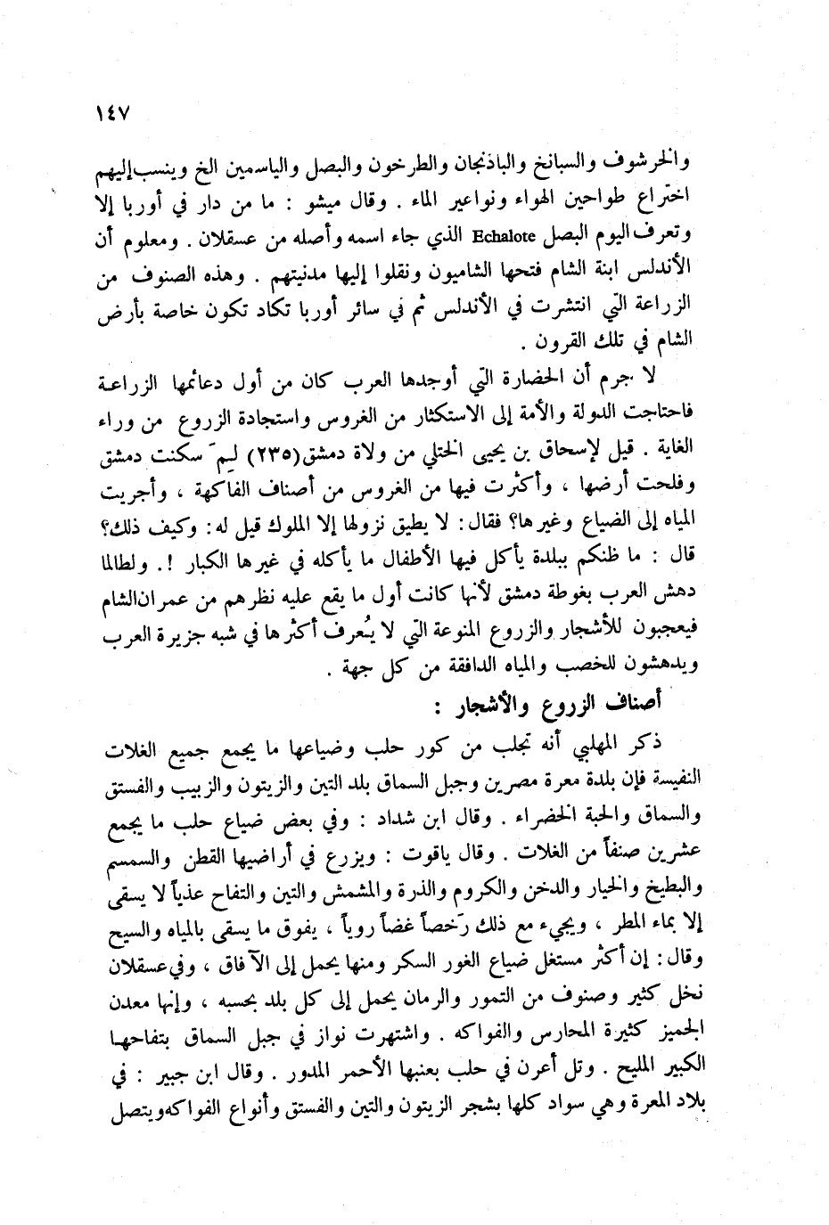 والخرشوف والسبانخ والباذنجان والطرخون والبصل والياسمين الخ وينسب إليهم اختراع طواحين الهواء ونواعير الماء. وقال ميشو: ما من دار في أوربا إلا وتعرف اليوم البصل الذي جاء اسمه وأصله من عسقلان. ومعلوم أن الأندلس ابنة الشام فتحها الشاميون ونقلوا إليها مدنيتهم. وهذه الصنوف من الزراعة التي انتشرت في الأندلس ثم في سائر أوربا تكاد تكون خاصة بأرض الشام في تلك القرون.