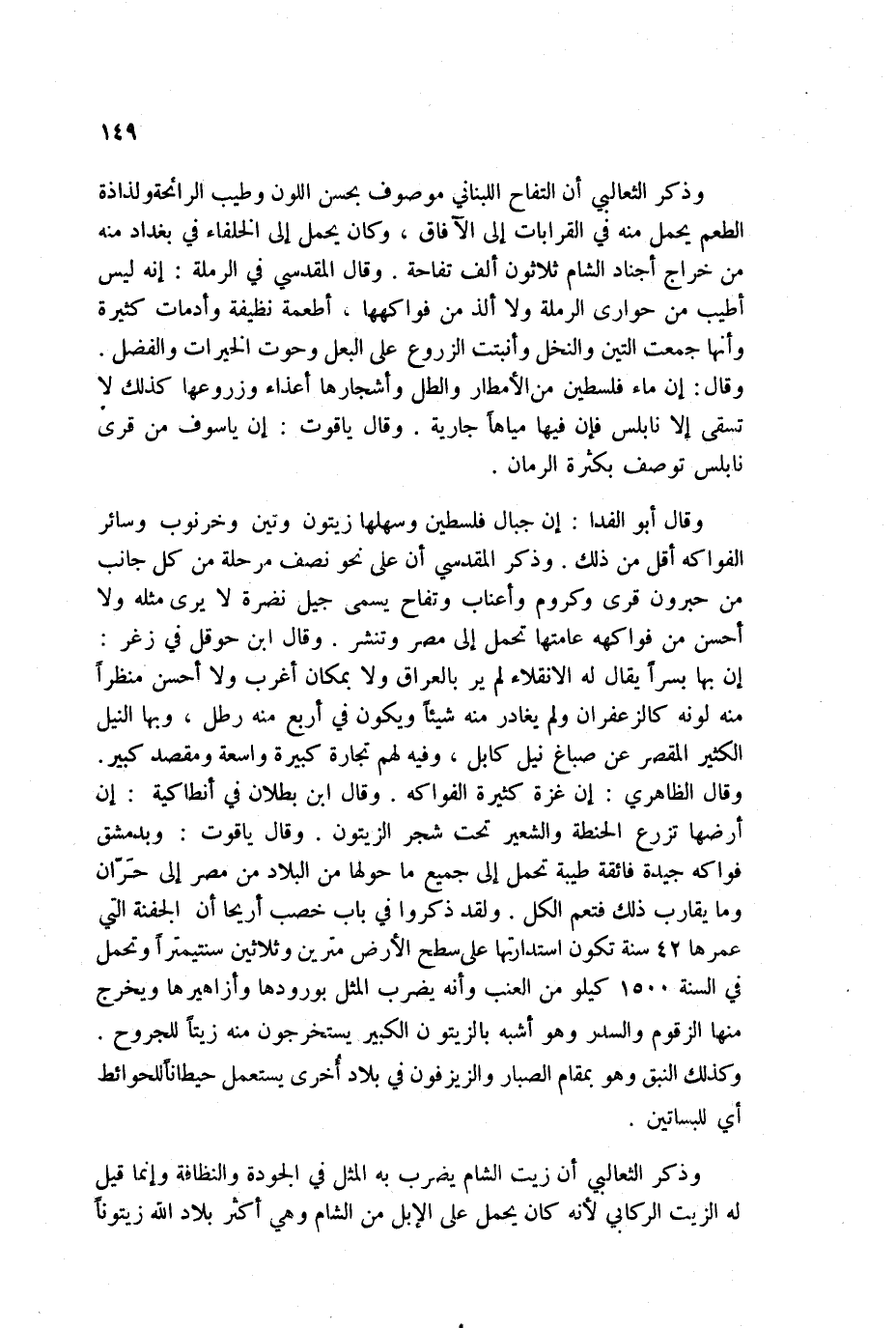 وقال أبو الفدا: إن جبال فلسطين وسهلها زيتون وتين وخرنوب وسائر الفواكه أقل من ذلك. وذكر المقدسي أن على نحو نصف مرحلة من كل جانب من حبرون قرى وكروم وأعناب وتفاح يسمى جيل نضرة لا يرى مثله ولا أحسن من فواكهه عامتها تحمل إلى مصر وتنشر. وقال ابن حوقل في زغر: إن بها بسراً يقال له الانقلاء لم ير بالعراق ولا بمكان أغرب ولا أحسن منظراً منه لونه كالزعفران ولم يغادر منه شيئاً ويكون في أربع منه رطل، وبها النيل الكثير المقصر عن صباغ نيل كابل، وفيه لهم تجارة كبيرة واسعة ومقصد كبير. وقال الظاهري: إن غزة كثيرة الفواكه. وقال ابن بطلان في إنطاكية: إن أرضها تزرع الحنطة والشعير تحت شجر الزيتون. وقال ياقوت: وبدمشق فواكه جيدة فائقة طيبة تحمل إلى جميع ما حولها من البلاد من مصر إلى حَرّان وما يقارب ذلك فتعم الكل. ولقد ذكروا في باب خصب أريحا أن الجفنة التي عمرها 42 سنة تكون استدارتها على سطح الأرض مترين وثلاثين سنتيمتراً وتحمل في السنة 1500 كيلو من العنب وأنه يضرب المثل بورودها وأزاهيرها ويخرج منها الزقوم والسدر وهو أشبه بالزيتون الكبير يستخرجون منه زيتاً للجروح. وكذلك النبق وهو بمقام الصبار والزيزفون في بلاد أُخرى يستعمل حيطاناً للحوائط أي للبساتين.