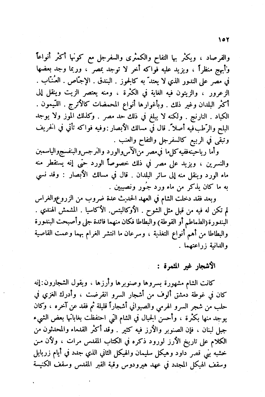 والفرصاد، ويكثر بها التفاح والكمثرى والسفرجل مع كونها أكثر أنواعاً وأبهج منظراً، ويزيد عليه فواكه أخر لا توجد بمصر، وربما وجد بعضها في مصر على الندور الذي لا يعتد به كالجوز. البندق. الأجاص. العُنّاب. الزعرور، والزيتون فيه الغاية في الكثرة، ومنه يعتصر الزيت وينقل إلى أكثر البلدان وغير ذلك. وبأغوارها أنواع المحمضات كالأترج. اللّيمون. الكباد. النارنج. ولكنه لا يبلغ في ذلك حد مصر. وكذلك الموز ولا يوجد البلح والرّطب فيه أصلاً. قال في مسالك الأبصار: وفيه فواكه تأتي في الخريف وتبقى في الربيع كالسفرجل والتفاح والعنب.