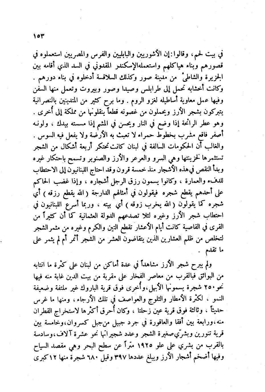 في بيت لحم، وقالوا: إن الأشوريين والبابليين والفرس والمصريين استعملوه في قصورهم وبناء هياكلهم واستعمله الأسكندر المقدوني في السد الذي أقامه بين الجزيرة والشاطئ من مدينة صور وكذلك السلاقسة أدخلوه في بناء دورهم. وكانت أخشابه تحمل إلى طرابلس وصيدا وصور وبيروت وتعمل منها السفن وفيها عمل معاوية أساطيله لغزو الروم. وما برح كثير من المتدينين بالنصرانية يتبركون بشجر الأرز ويحملون من غصونه قطعاً ينقلونها من مملكة إلى أُخرى. وهو عطر الرائحة إذا وضع في النار ويحسن في المشم إذا مسسته بيدك، ولونه اصفر فاقع مشرب بخطوط حمراء لا تعبث به الأرضة ولا يفعل فيه السوس. والغالب أن الحكومات السالفة في لبنان كانت تحتكر أربعة أشكال من الشجر تستثمرها لخزينتها وهي السرو والعرعر والأرز والصنوبر وتسمح باحتكار غيره وبدأ النقص في هذه الأشجار منذ خمسة قرون وقد احتاج اللبنانيون إلى الاحتطاب للدفء والعمارة، وكانوا يسمون رزق الرجل أشجاره، وإذا غضب الحاكم على أحدهم يقطع شجره فيقولون في أمثالهم الدارجة الله يقطع رزقه أي شجره كما يقولون الله يخرب زوقه أي بيته، وربما أسرع اللبنانيون في احتطاب شجر الأرز وغيره لئلا تصدعهم الدولة العثمانية كما أن كثيراً من القرى في القاصية كانت أيام الأعشار تقطع التين والكرم وغيره من