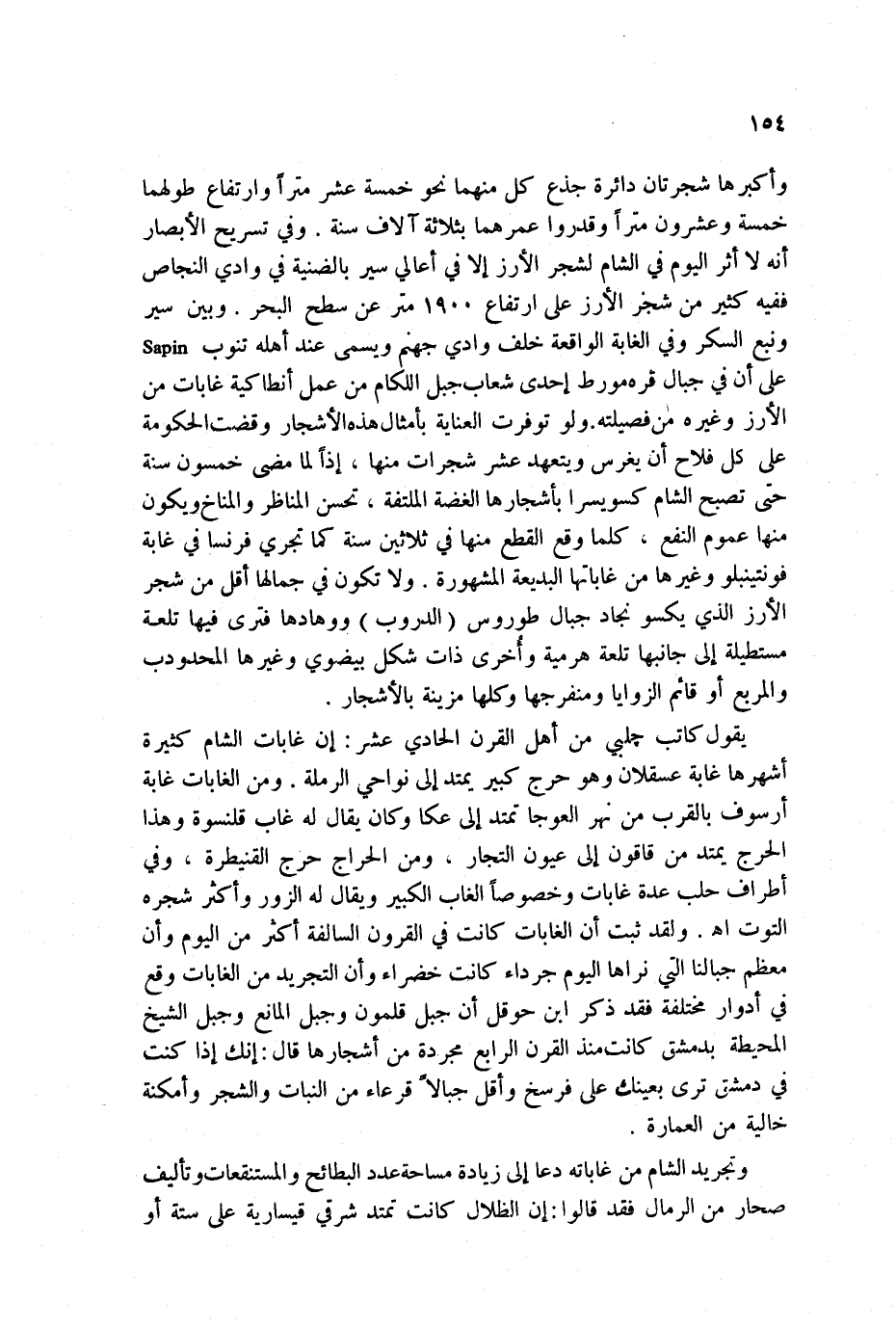 وأكبرها شجرتان دائرة جذع كل منهما نحو خمسة عشرة متراً وارتفاع طولهما خمسة وعشرون متراً وقدروا عمرهما بثلاثة آلاف سنة. وفي تسريح الأبصار أنه لا أثر اليوم في الشام لشجر الأرز إلا في أعالي سير بالضنية في وادي النجاص ففيه كثير من شجر الأرز على ارتفاع 1900 متر عن سطح البحر. وبين سير ونبع السكر وفي الغابة الواقعة خلف وادي جهنم ويسمى عند أهله تنوب على أن في جبال قره مورط إحدى شعاب جبل اللكام من عمل إنطاكية غابات من الأرز وغيره من فصيلته. ولو توفرت العناية بأمثال هذه الأشجار وقضت الحكومة على كل فلاح ان يغرس ويتعهد عشر شجرات منها، إذاً لما مضى خمسون سنة حتى تصبح الشام كسويسرا بأشجارها الغضة الملتفة، تحسن المناظر والمناخ ويكون منها عموم النفع، كلما وقع القطع منها في ثلاثين سنة كما تجري فرنسا في غابة فونتينبلو وغيرها من غاباتها البديعة المشهورة. ولا تكون في جمالها أقل من