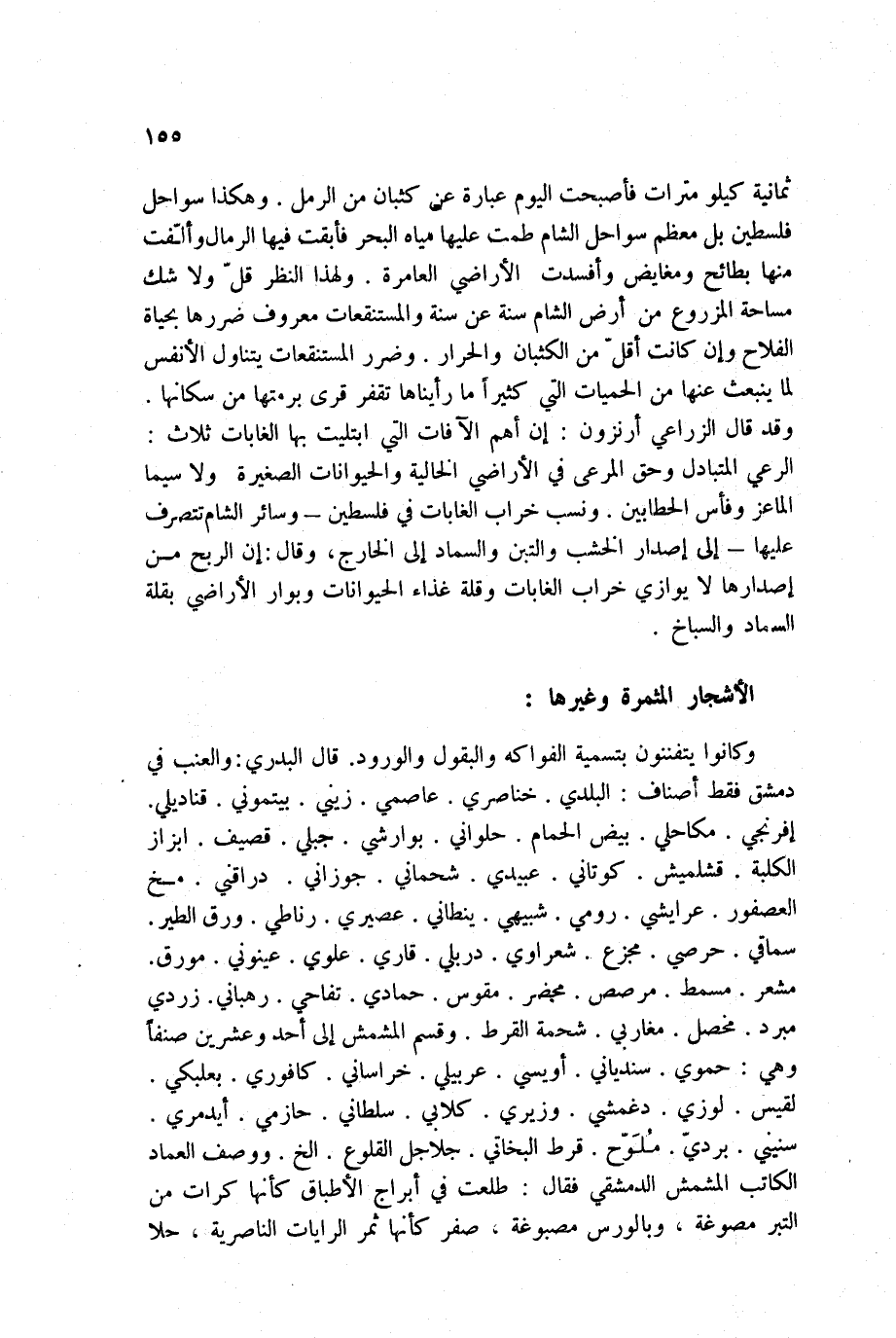 المتبادل وحق المرعى في الأراضي الخالية والحيوانات الصغيرة ولا سيما الماعز وفأس الحطابين. ونسب خراب الغابات في فلسطين - وسائر الشام تتصرف عليها - إلى إصدار الخشب والتبن والسماد إلى الخارج، وقال: إن الربح من إصدارها لا يوازي خراب الغابات وقلة غذاء الحيوانات وبوار الأراضي بقلة السماد والسباخ.