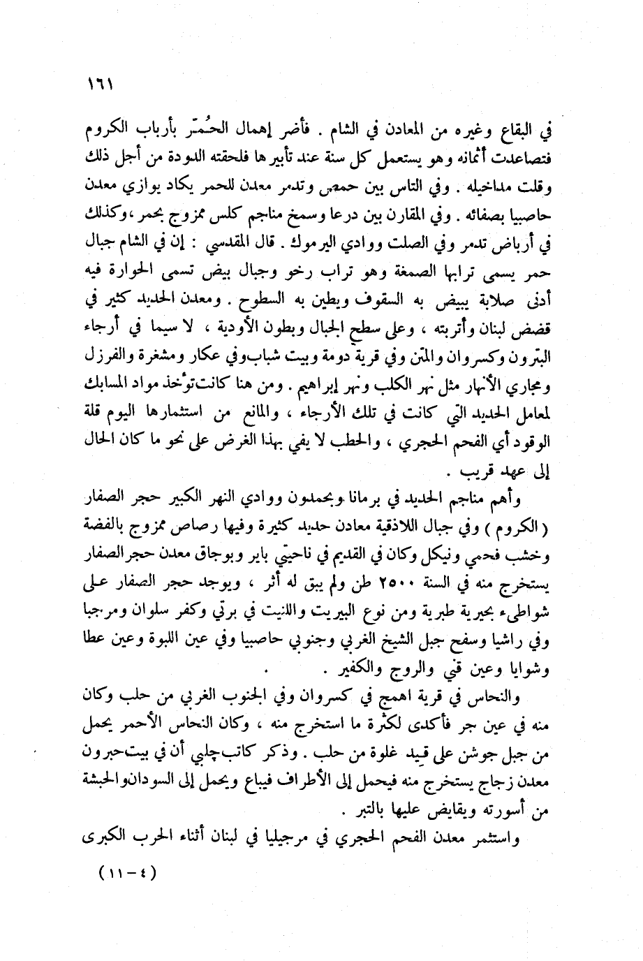 في البقاع وغيره من المعادن في الشام. فأضر إهمال الحُمّر بأرباب الكروم فتصاعدت أثمانه وهو يستعمل كل سنة عند تأبيرها فلحقته الدودة من أجل ذلك وقلت مداخيله. وفي التاس بين حمص وتدمر معدن للحمر يكاد يوازي معدن حاصبيا بصفائه. وفي المقارن بين درعا وسمخ مناجم كلس ممزوج بحمر، وكذلك في أرباض تدمر وفي الصلت ووادي اليرموك. قال المقدسي: إن في الشام جبال حمر يسمى ترابها الصنغة وهو تراب رخو وجبال بيض تسمى الحوارة فيه أدنى صلابة يبيض به السقوف ويطين به السطوح. ومعدن الحديد كثير في قضض لبنان واتربته، وعلى سطح الجبال وبطون الأودية، لا سيما في ارجاء البترون وكسروان والمتن وفي قرية دومة وبيت شباب وفي عكار ومشغرة والفرزل ومجاري الأنهار مثل نهر الكلب ونهر إبراهيم. ومن هنا كانت تؤخذ مواد المسابك لمعامل الحديد التي كانت في تلك الأرجاء، والمانع من استثمارها اليوم قلة الوقود أي الفحم الحجري، والحطب لا يفي بهذا الغرض على نحو ما كان الحال إلى عهد قريب.