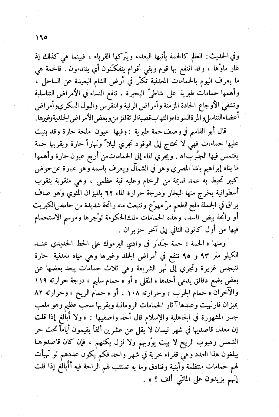 وفي الحديث: العالم كالحمة يأتيها البعداء ويتركها القرباء، فبينما هي كذلك إذ غار ماؤها، وقد انتفع بها قوم وبقي أقوام يتفكّنون أي يتندمون. فالحمة هي ما يعرف اليوم بالحمامات المعدنية تكثر في أرض الشام البعيدة عن الساحل، وأهمها حمامات طبرية على شاطئ البحيرة، تنفع النساء في الأمراض التناسلية وتشفي الأوجاع الحادة المزمنة وأمراض الرثية والنقرس والبول السكري وأمراض أعضاء التناسل والمرة والسوداء والتهاب قصبة الرئة المزمن وبعض الأمراض الجلدية وغيرها. قال أبو القاسم في وصف حمة طبرية: وفيها عيون ملحة حارة وقد بنيت عليها حمامات فهي لا تحتاج إلى الوقود تجري ليلاً ونهاراً حارة وبقربها حمة يغتمس فيها الجُرب اه. ويجري الماء إلى الحمامات من أربع عيون حارة وأهمها ما بناه إبراهيم باشا المصري وهو في الشمال ويعرف باسمه وهو عبارة عن حوض كبير تحيط به عمد قديمة من الرخام وعليه قبة عظمى، وهي مثقوبة بثقوب أسطوانية يخرج منها البخار ودرجة حرارة الماء 62 بالميزان المئوي وهو صاف براق في الجملة ملح الطعم مرّ مهوّع وتنبعث منه رائحة شديدة من حامض الكبريت أو رائحة بيض فاسد، وهذه الحمامات ملك الحكومة تؤجرها وموسم الاستحمام فيها من أول كانون الثاني إلى آخر حزيران.