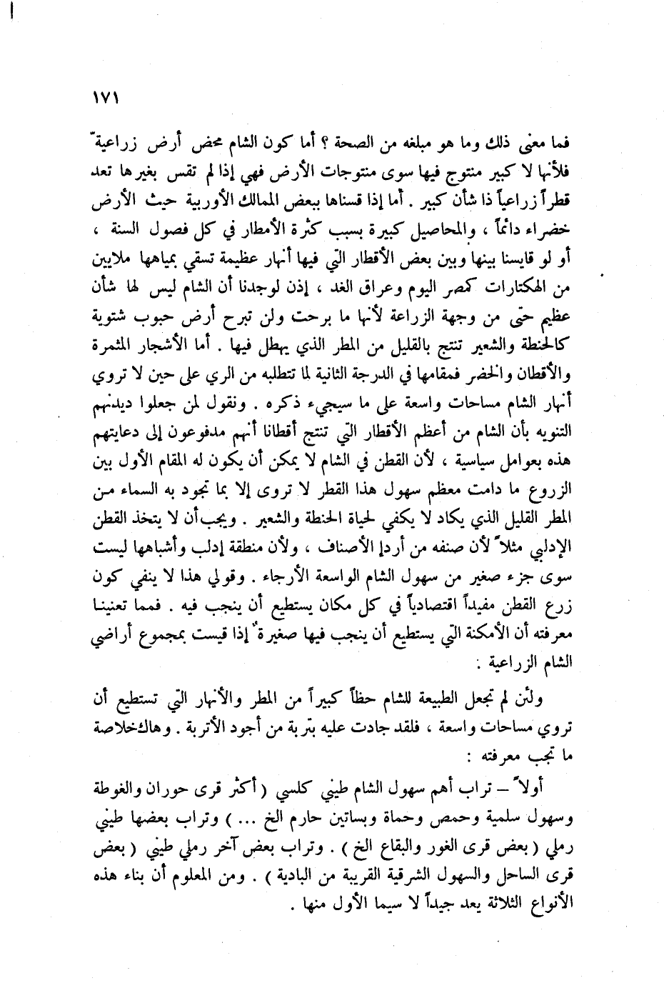 معنى ذلك وما هو مبلغه من الصحة؟ أما كون الشام محض أرض زراعية فلأنها لا كبير منتوج فيها سوى منتوجات الأرض فهي إذا لم تقس بغيرها تعد قطراً زراعياً ذا شأن كبير. أما إذا قسناها ببعض الممالك الأوربية حيث الأرض خضراء دائماً، والمحاصيل كبيرة بسبب كثرة الأمطار في كل فصول السنة، أو لو قيسنا بينها وبين بعض الأقطار التي فيها أنهار عظيمة تسقي بمياهها ملايين من الهكتارات كمصر اليوم وعراق الغد، إذن لوجدنا أن الشام ليس لها شأن عظيم حتى من وجهة الزراعة لأنها ما برحت ولن تبرح أرض حبوب شتوية كالحنطة والشعير تنتج بالقليل من المطر الذي يهطل فيها. أما الأشجار المثمرة والأقطان والخضر فمقامها في الدرجة الثانية لما تتطلبه من الري على حين لا تروي أنهار الشام مساحات واسعة على ما سيجيء ذكره. ونقول لمن جعلوا ديدنهم التنويه بأن الشام من أعظم الأقطار التي تنتج أقطانا أنهم مدفوعون إلى دعايتهم هذه بعوامل سياسية، لأن القطن في الشام لا يمكن أن يكون له المقام الأول بين الزروع ما دامت معظم سهول هذا القطر لا تروى إلا بما تجود به السماء من المطر القليل الذي يكاد لا يكفي لحياة الحنطة والشعير. ويجب أن لا يتخذ القطن الإدلبي مثلاً لأن صنفه من أردإ الأصناف، ولأن منطقة إدلب وأشباهها ليست سوى جزء صغير من سهول الشام الواسعة الأرجاء. وقولي هذا لا ينفي كون زرع القطن مفيداً اقتصادياً في كل مكان يستطيع أن ينجب فيه. فمما تعنينا معرفته أن الأمكنة التي يستطيع أن ينجب فيها صغيرة إذا قيست بمجموع أراضي الشام الزراعية.