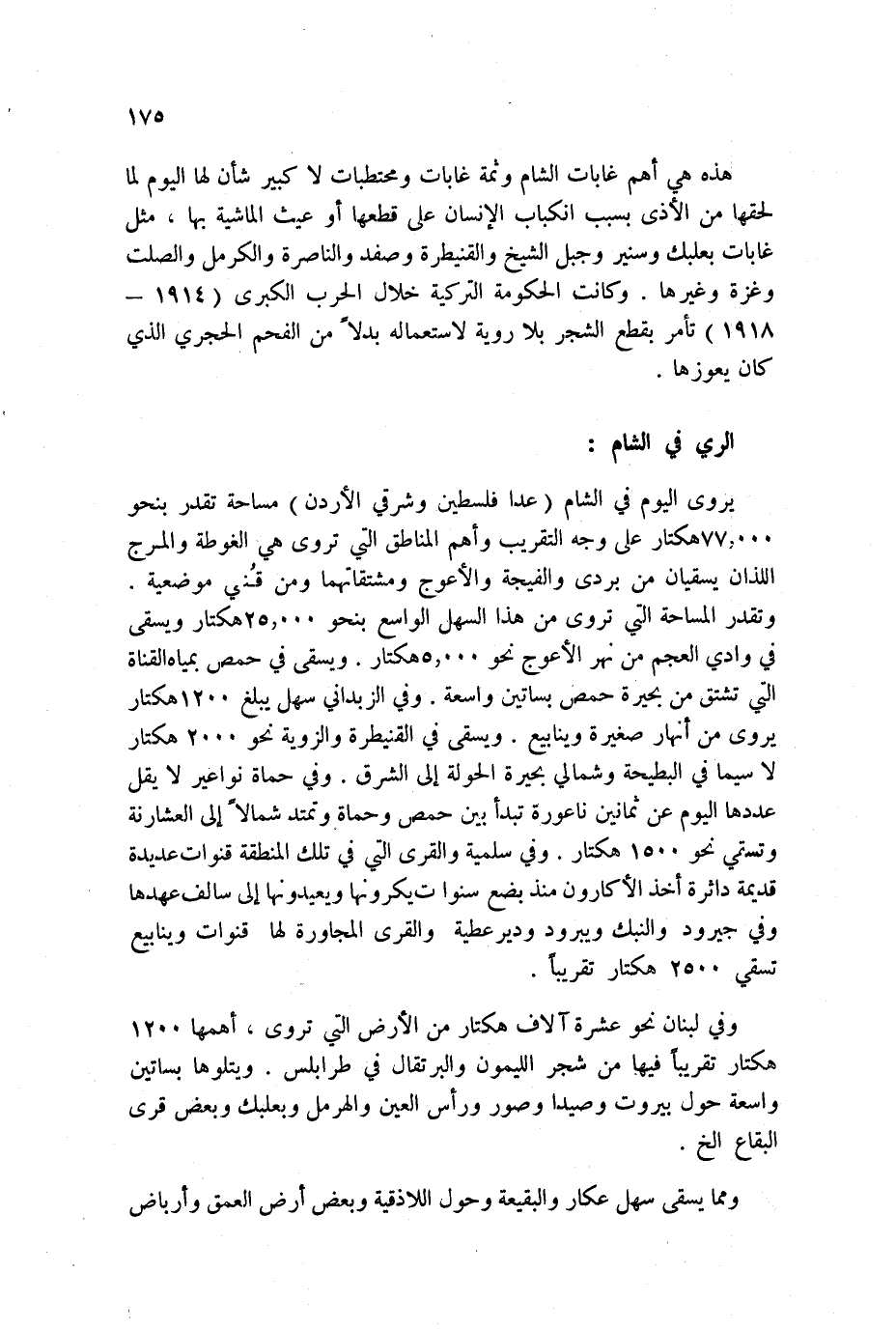 هكتار على وجه التقريب وأهم المناطق التي تروى هي الغوطة والمرج اللذان يسقيان من بردى والفيجة والأعوج ومشتقاتهما ومن قُني موضعية. وتقدر المساحة التي تروى من هذا السهل الواسع بنحو 25000 هكتار ويسقى في وادي العجم من نهر الأعوج نحو 5000 هكتار. ويسقى في حمص بمياه القناة التي تشتق من بحيرة حمص بساتين واسعة. وفي الزبداني سهل يبلغ 1200 هكتار يروى من أنهار صغيرة وينابيع. ويسقى في القنيطرة والزوية نحو 2000 هكتار لا سيما في البطيحة وشمالي بحيرة الحولة إلى الشرق. وفي حماة نواعير لا يقل عددها اليوم عن ثمانين ناعورة تبدأ بين حمص وحماة وتمتد شمالاً إلى العشارنة وتسقي نحو 1500 هكتار. وفي سلمية والقرى التي في تلك المنطقة قنوات عديدة قديمة داثرة أخذ الأكارون منذ بضع سنوات يكرزنها ويعيدونها إلى سالف عهدها وزفي جيرود والنبك ويبرود ودير عطية والقرى المجاورة لها قنوات وينابيع تسقي 2500 هكتار تقريباً.