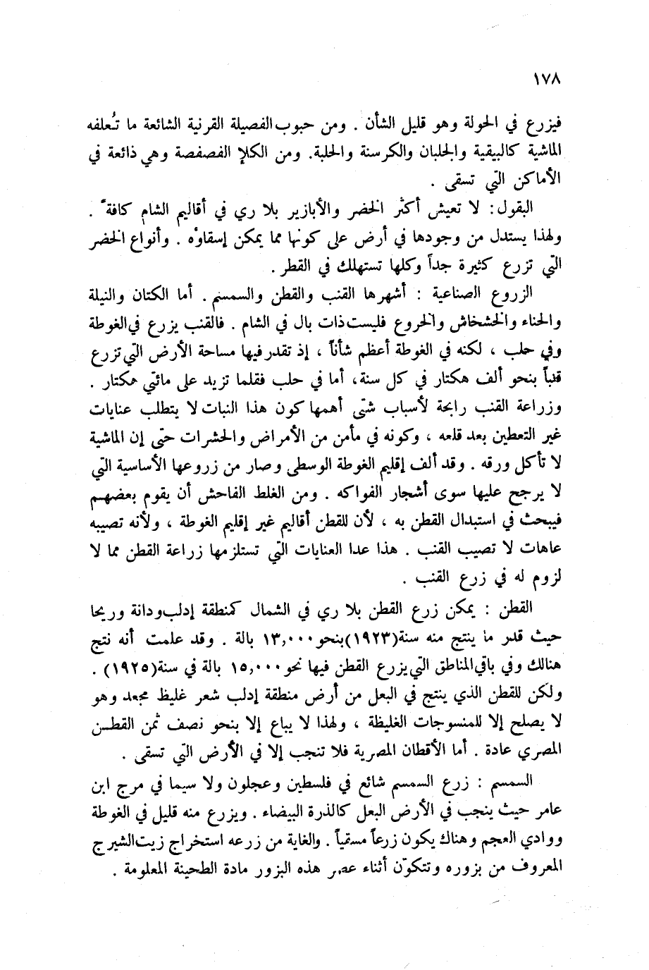 القطن: يمكن زرع القطن بلا ري في الشمال كمنطقة إدلب ودانة وريحا حيث قدر ما ينتج منه سنة 1923 بنحو 13000 بالة. وقد علمت أنه نتج هنالك وفي باقي المناطق التي يزرع القطن فيها نحو 15000 بالة في سنة 1925. ولكن للقطن الذي ينتج في البعل من أرض منطقة إدلب شعر غليظ مجعد وهو لا يصلح إلا للمنسوجات الغليظة، ولهذا لا يباع إلا بنحو نصف ثمن القطن المصري عادة. أما الأقطان المصرية فلا تنجب إلا في الأرض التي تسقى.