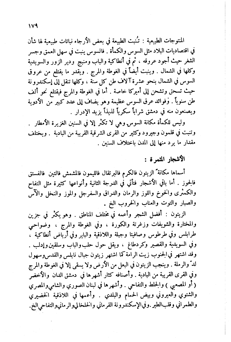 الزيتون: أفضل الشجر وأعمه في مختلف المناطق. وهو يكثر في جزين والمختارة والشويفات وزغرتة والكورة، وفي الغوطة والمرج، وضواحي طرابلس