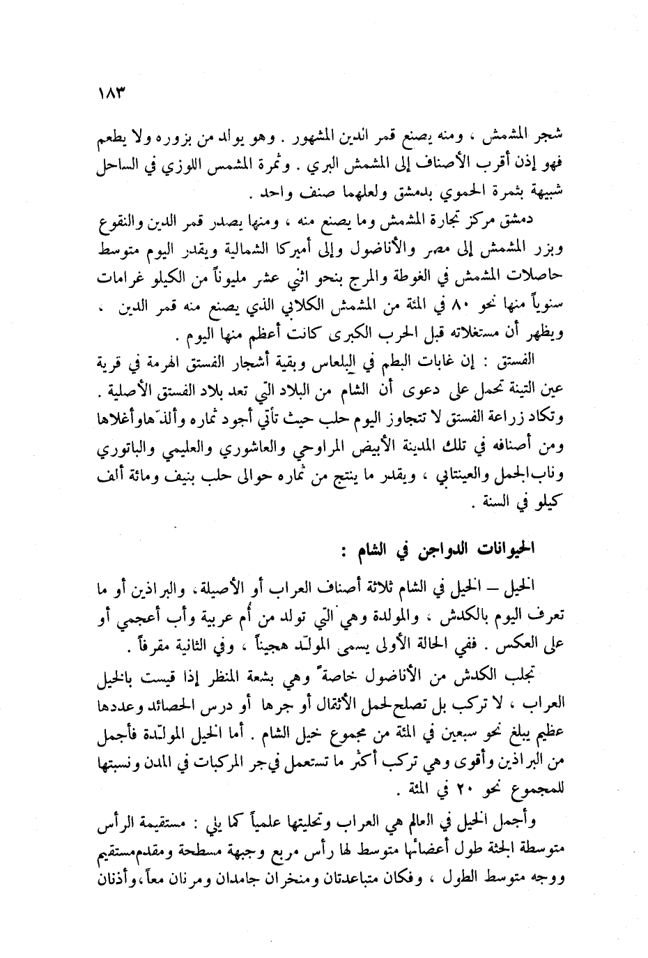 الخيل: الخيل في الشام ثلاثة أصناف العراب أو الأصيلة، والبراذين أو ما تعرف اليوم بالكدش، والمولدة وهي التي تولد من أُم عربية وأب أعجمي أو على العكس. ففي الحالة الأولى يسمى المولّد هجيناً، وفي الثانية مقرفاً.