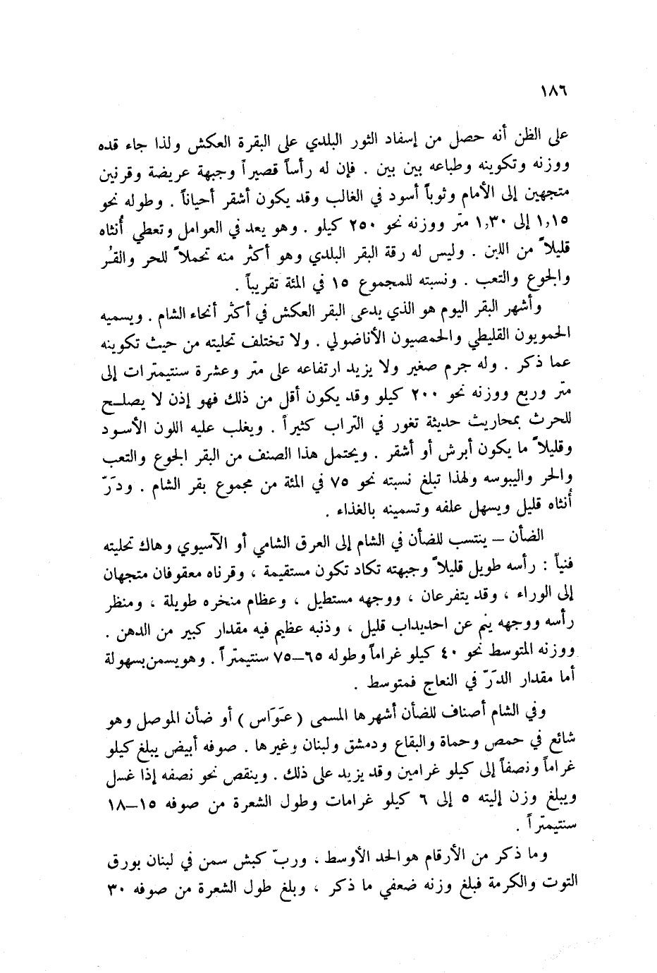 الضأن: ينتسب للضأن في الشام إلى العرق الشامي أو الآسيوي وهاك تحليته فنياً: رأسه طويل قليلاً وجبهته تكاد تكون مستقيمة، وقرناه معقوفان متجهان إلى الوراء، وقد يتفرعان، ووجهه مستطيل، وعظام منخره طويلة، ومنظر رأسه ووجهه ينم عن احديداب قليل، وذنبه عظيم فيه مقدار كبير من الدهن. ووزنه المتوسط نحو 40 كيلو غراماً وطوله 65 - 75 سنتيمتراً. وهو يسمن بسهولة أما مقدار الدَرّ في النعاج فمتوسط.