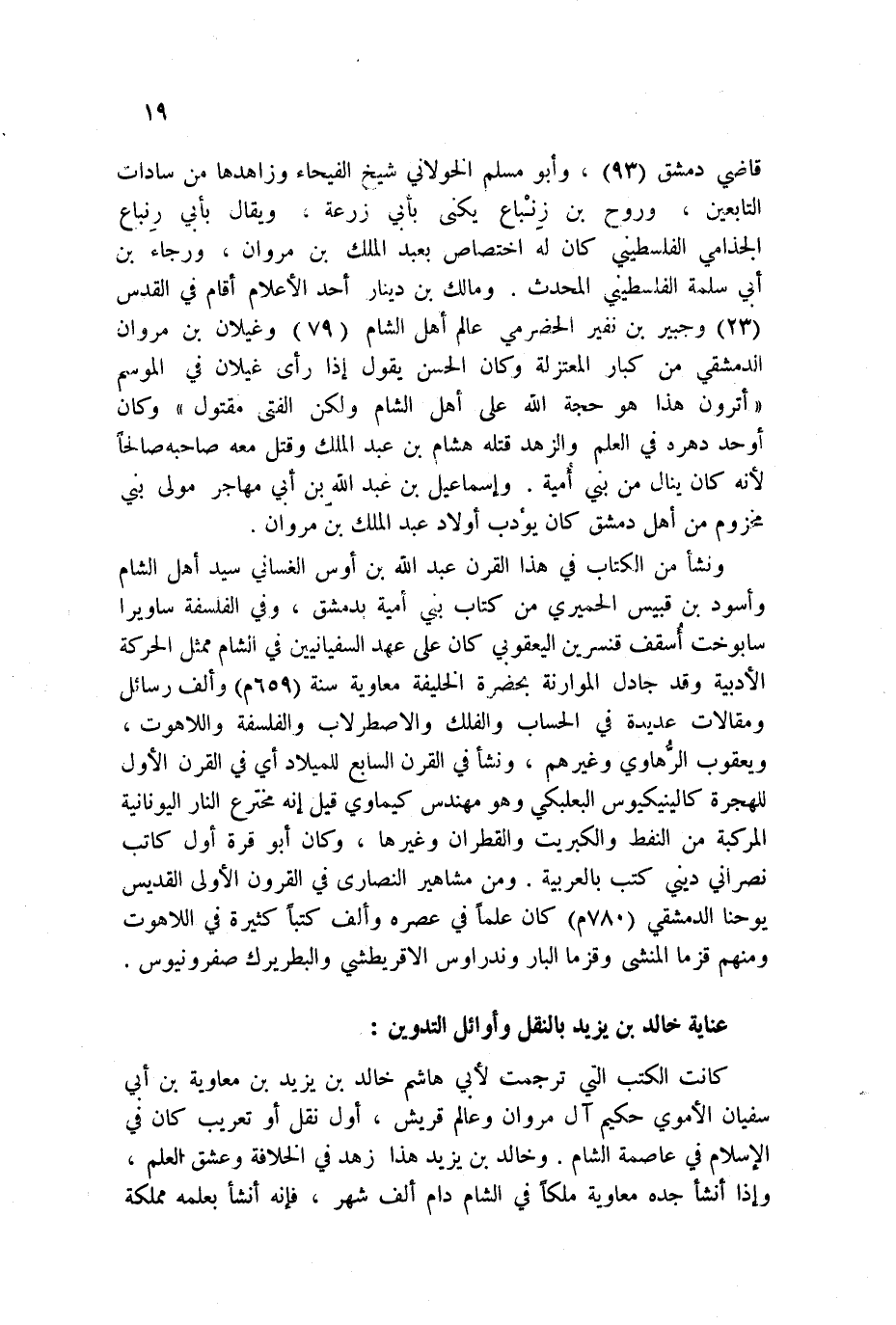كانت الكتب التي ترجمت لأبي هاشم خالد بن يزيد بن معاوية بن أبي سفيان الأموي حكيم آل مروان وعالم قريش، أول نقل أو تعريب كان في الإسلام في عاصمة الشام. وخالد بن يزيد هذا زهد في الخلافة وعشق العلم، وإذا أنشأ جده معاوية ملكاً في الشام دام ألف شهر، فإنه أنشأ بعلمه مملكة