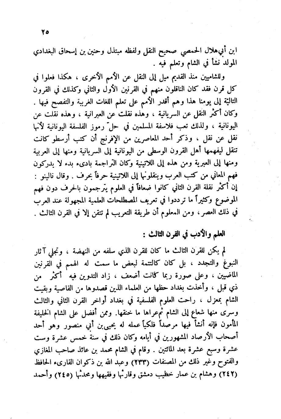 السريانية، وهذه نقلت عن العبرانية، وهذه نقلت عن اليونانية، ولذلك تعب فلاسفة المسلمين في حل رموز الفلسفة اليونانية لأنها نقل عن نقل، وذكر أحد المعاصرين من الإفرنج أن كتب أرسطو كانت تنقل ليفهمها أهل القرون الوسطى من اليونانية إلى السريانية ومنها إلى العربية ومنها إلى العبرية ومن هذه إلى اللاتينية وكان التراجمة بادئ بدء لا يدركون فهم المعاني من كتب العرب وينقلونها إلى اللاتينية حرفاً بحرف. وقال نالينو: إن أكثر نقلة القرن الثاني كانوا ضعافاً في العلوم يترجمون بالحرف دون فهم الموضوع وكثيراً ما ترددوا في تعريب المصطلحات العلمية المجهولة عند العرب في ذلك العصر، ومن المعلوم أن طريقة التعريب لم تتقن إلا في القرن الثالث.
