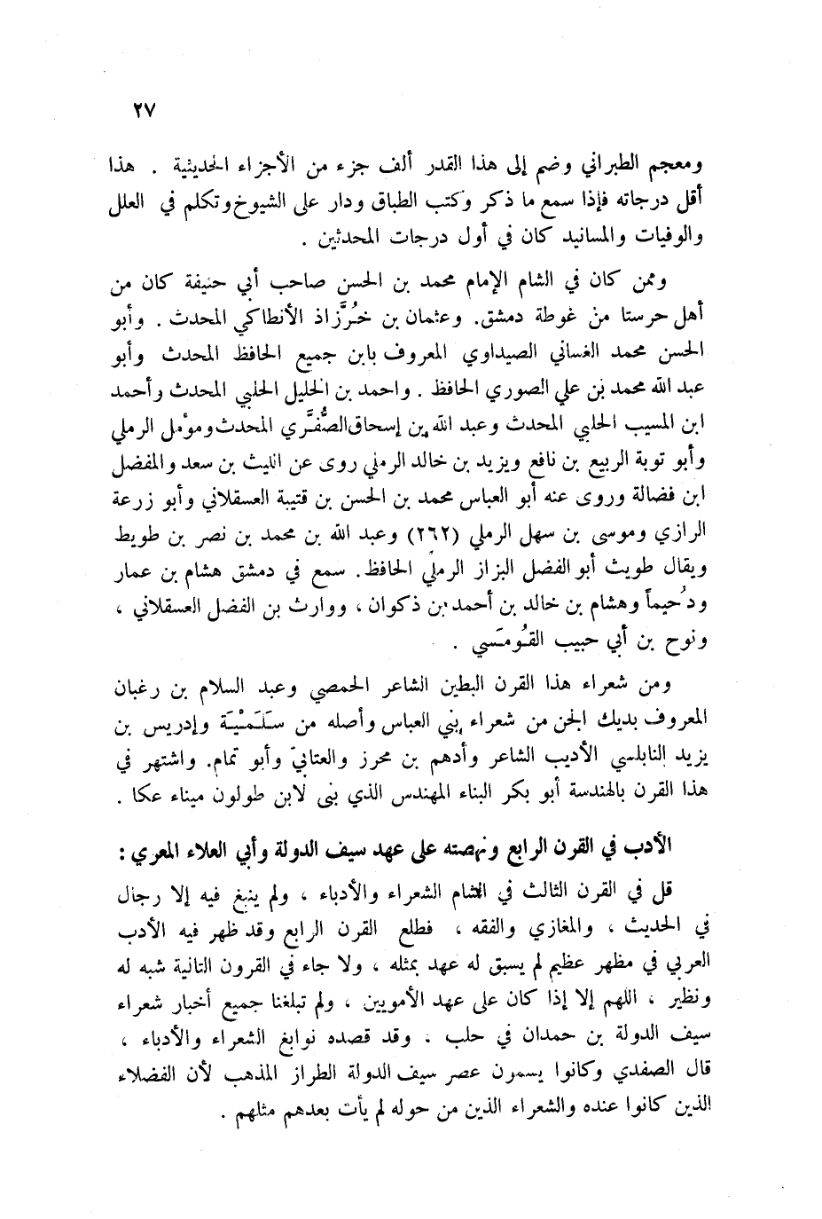 قل في القرن الثالث في الشام الشعراء والأدباء، ولم ينبغ فيه إلا رجال في الحديث، والمغازي والفقه، فطلع القرن الرابع وقد ظهر فيه الأدب العربي في مظهر عظيم لم يسبق له عهد بمثله، ولا جاء في القرون التالية شبه له ونظير، اللهم إلا إذا كان على عهد الأمويين، ولم تبلغنا جميع أخبار شعراء سيف الدولة بن حمدان في حلب، وقد قصده نوابغ الشعراء والأدباء، قال الصفدي وكانوا يسمون عصر سيف الدولة الطراز المذهب لأن الفضلاء الذين كانوا عنده والشعراء الذين من حوله لم يأت بعدهم مثلهم.