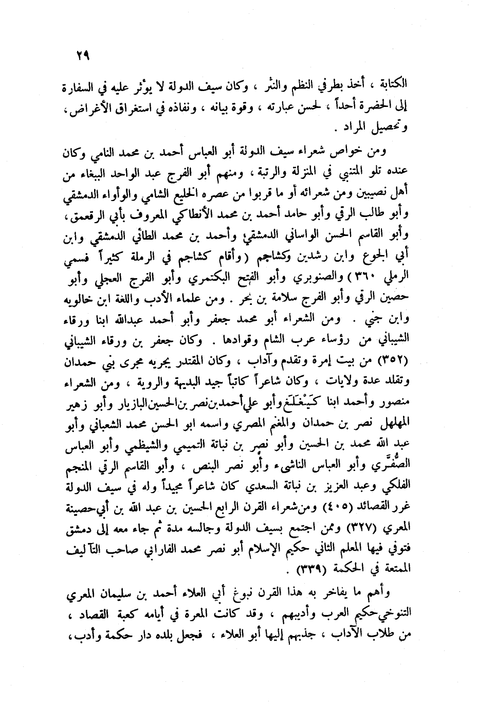 يجريه مجرى بني حمدان وتقلد عدة ولايات، وكان شاعراً كاتباً جيد البديهية والروية، ومن الشعراء منصور وأحمد ابنا كَيْغَلَغ وأبو علي أحمد بن نصر بن الحسين البازيار وأبو زهير المهلهل نصر بن حمدان والمغنم المصري واسمه أبو الحسن محمد الشعباني وأبو عبد الله محمد بن الحسين وأبو نصر بن نباتة التميمي والشيظمي وأبو العباس الصُّفَّري وأبو العباس الناشئ وأبو نصر البنص، وأبو القاسم الرقي المنجم الفلكي وعبد العزيز بن نباتة السعدي كان شاعرا مجيداً وله في سيف الدولة غرر القصائد 405 ومن شعراء القرن الرابع الحسين بن عبد الله بن أبي حصينة المعري 327 وممن اجتمع بسيف الدولة وجالسه مدة ثم جاء معه إلى دمشق فتوفي فيها المعلم الثاني حكيم الإسلام أبو نصر محمد الفارابي صاحب التآليف الممتعة في الحكمة 339.