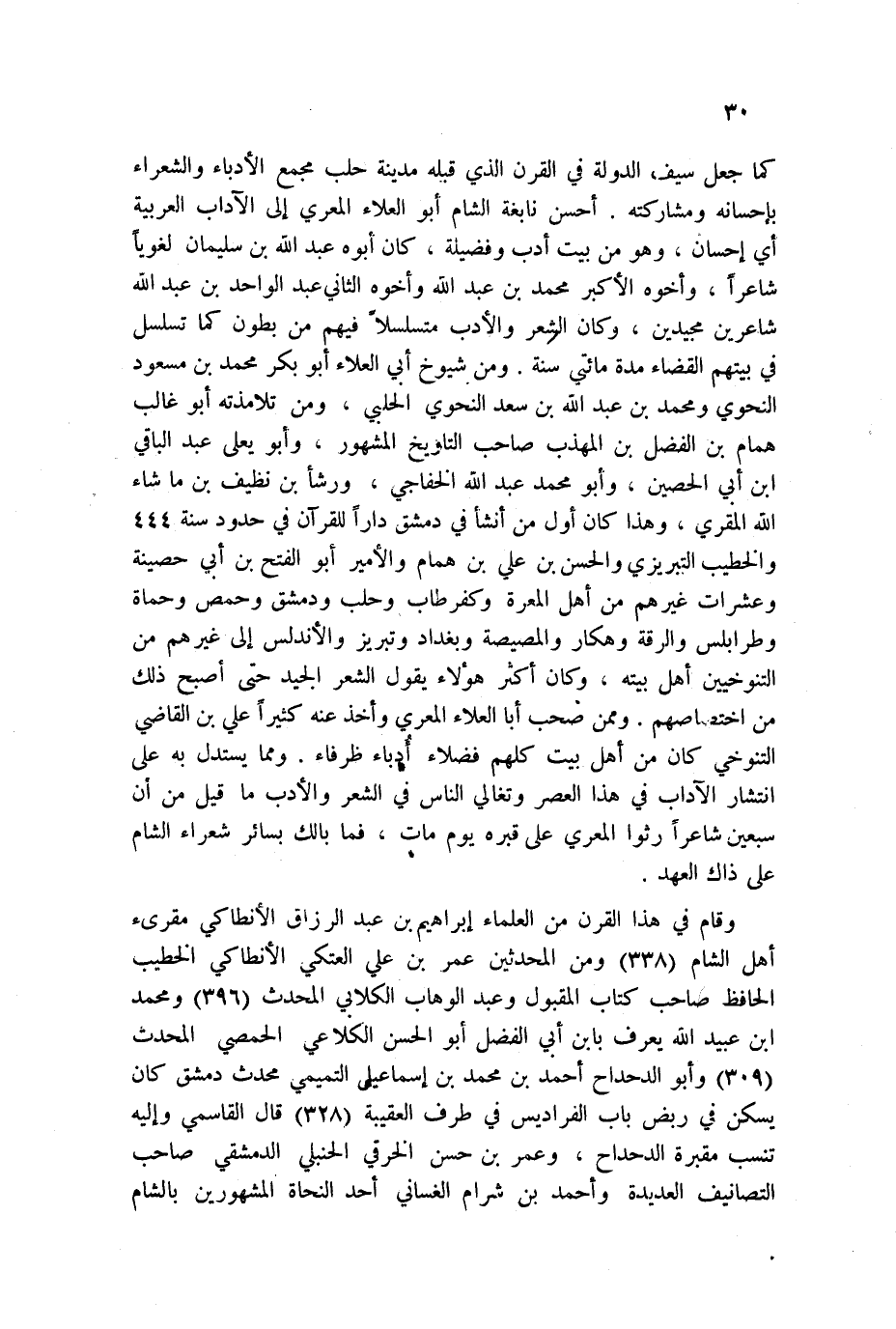 كما جعل سيف الدولة في القرن الذي قبله مدينة حلب مجمع الأدباء والشعراء بإحسانه ومشاركته. أحسن نابغة الشام أبو العلاء المعري إلى الآداب العربية أي إحسان، وهو من بيت أدب وفضيلة، كان أبوه عبد الله بن سليمان لغوياً شاعراً، وأخوه الأكبر محمد بن عبد الله وأخوه الثاني عبد الواحد بن عبد الله شاعرين مجيدين، وكان الشعر والأدب متسلسلاً فيهم من بطون كما تسلسل في بيتهم القضاء مدة مائتي سنة. ومن شيوخ أبي العلاء أبو بكر محمد بن مسعود النحوي ومحمد بن عبد الله بن سعد النحوي الحلبي، ومن تلامذته أبو غالب همام بن الفضل بن المهذب صاحب التاريخ المشهور، وأبو يعلى عبد الباقي ابن أبي الحصين، وأبو محمد عبد الله الخفاجي، ورشأ بن نظيف بن ما شاء الله المقري، وهذا كان أول من أنشأ في دمشق داراً