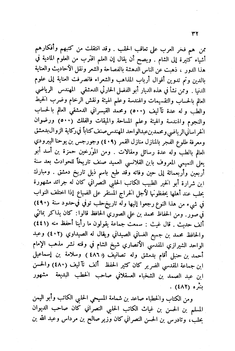 ممن هم فخر العرب على تعاقب الحقب. وقد انتقلت من كتبهم وأفكارهم أشياء كثيرة إلى الشام. ويصح أن يقال إن العلم اقترب من العلوم المادية في هذا الدور، ذهبت عن الناس الدهشة بالفصاحة والشعر ونقل الأحاديث والعناية بالدين وتم تدوين أقوال أرباب المذاهب والشعراء فانصرفت العناية إلى علوم الدنيا. وممن نشأ في هذه الديار أبو الفضل الحارثي الدمشقي المهندس الرياضي العالم بالحساب والتقسيمات والهندسة وعلم الهيئة ونقش الرخام وضرب الخيط والطب وله عدة تآليف 500 ومحمد القيسراني الدمشقي العالم بالحساب والنجوم والهندسة والهيئة وعلم المساحة والميقات والفلك 500 ورضوان الخراساني الرياضي ومحمد بن عبد الواحد المهندس صنف كتاباً في ركاية الزوال بدمشق ومعرفة طلوع الفجر بالمنازل منازل القمر 409 وجورجس بن يوحنا اليبرودي العالم بالطب وله عدة رسائل ومقالات. ومن المؤرخين حمزة بن أسد أبو يعلى التميمي المعروف بابن القلانسي العميد صنف تاريخاً للحوادث بعد سنة أربعين وأربعمائة إلى حين وفاته وقد طبع باسم ذيل تاريخ دمشق. ومبارك ابن شرارة أبو الخير الطبيب الكاتب الحلبي النصراني كان له جرائد مشهورة بحلب عند أهلها يحفظونها لأجل الخراج المستقر على الضياع إذا اختلف النواب في شيء من هذا النوع رجعوا إليها وله تاريخ حلب توفي في حدود سنة 490 في صور. ومن الحفاظ محمد بن علي الصوري الحافظ قالوا: كان يذاكر بمائتي ألف حديث. قال غيث: سمعت جماعة يقولون ما رأينا أحفظ منه 441 والحافظ محمد بن جميع الغساني الصيداني ويقال له الصيداوي 402 وعبد الواحد الشيرازي المقدسي الأنصاري شيخ الشام في وقته