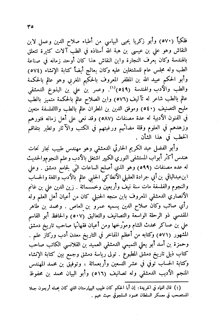 فلكياً 570 وأبو زكريا يحيى البياسي من أطباء صلاح الدين وعمل لابن النقاش وهو علي بن عيسى بن هبة الله أُستاذه في الطب آلات كثيرة تتعلق بالهندسة وكان يعرف النجارة وابن النقاش هذا كان أوحد زمانه في صناعة الطب وله مجلس عام للمشتغلين عليه وكان يعالج أيضاً كتابة الإنشاء 574 وأبو الحكم عبيد الله بن المظفر المعروف بالحكيم المغربي وهو عالم بالحكمة والطب والأدب والهندسة 549 (1). وعمر بن علي بن البذوخ الدمشقي عالم بالطب شاعر له تآليف 576 وابن الصلاح عالم بالحكمة متميز بالطب مليح التصنيف 540 وموفق الدين بن المطران عالم بالطب والفلسفة متعين في الفنون الأدبية له عدة مصنفات 587 وقد نعى على أهل زمانه فتورهم وزهدهم في العلوم وقلة مضائهم ورغبتهم في الكتب والآثار وتطير بتفاقم الخطب في هذا الشأن.