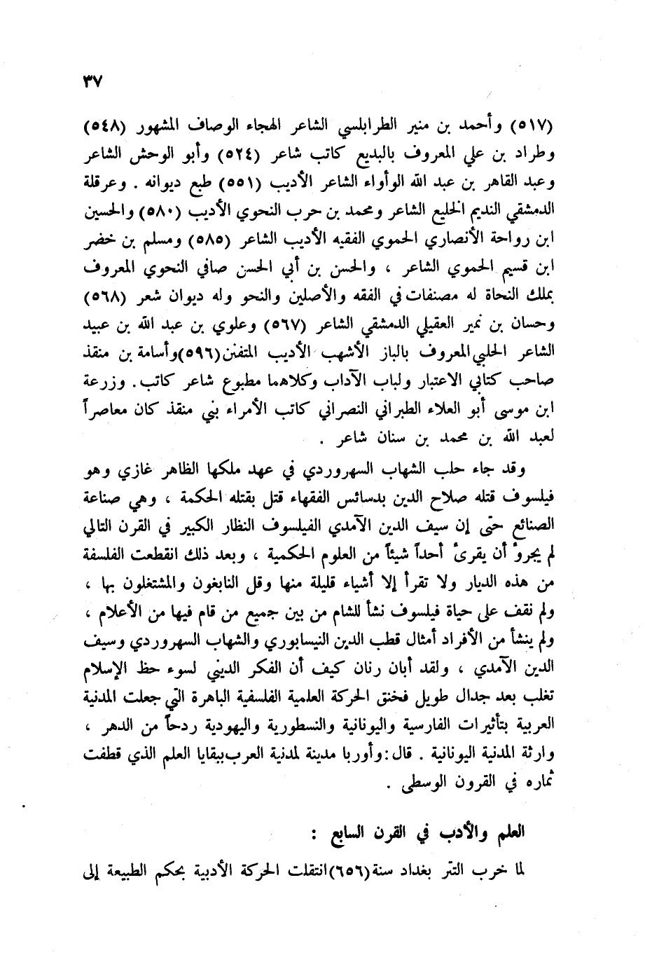 517 وأحمد بن منير الطرابلسي الشاعر الهجاء الوصاف المشهور 548 وطراد بن علي المعروف بالبديع كاتب شاعر 524 وأبو الوحش الشاعر وعبد القاهر بن عبد الله الوأواء الشاعر الأديب 551 طبع ديوانه. وعرقلة الدمشقي النديم الخليع الشاعر ومحمد بن حرب النحوي الأديب 580 والحسين ابن رواحة الأنصاري الحموي الفقيه الشاعر 585 ومسلم بن خضر ابن قسيم الحموي الشاعر، والحسن