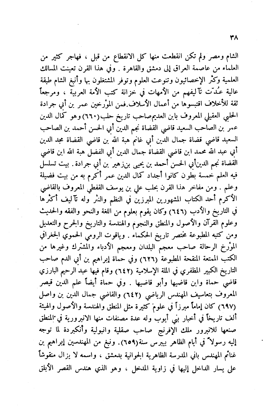تآليفهم من الأمهات في خزانة كتب الأمة العربية، ومرجعاً ثقة للأخلاف اقتبسوها من أعمال الأسلاف. فمن المؤرخين عمر بن أبي جرادة الحلبي العقيلي المعروف بابن العديم صاحب تاريخ حلب 660 وهو كمال الدين عمر بن الصاحب السعيد قاضي القضاة نجم الدين أبي الحسن أحمد بن الصاحب السعيد قاضي قضاة جمال الدين أبي غانم هبة الله بن قاضي القضاة مجد الدين أبي عبد الله محمد ابن قاضي القضاة جمال الدين أبي الفضل هبة الله ابن قاضي القضاة نجم الدين أبي الحسن أحمد بن يحيى بن زهير بن أبي جرادة. بيت تسلسل فيه العلم خمسة بطون كانوا أجداد كمال الدين عمر أكرم به من بيت فضيلة وعلم. ومن مفاخر هذا القرن بحلب علي بن يوسف القفطي المعروف بالقاضي الأكرم أحد الكتاب المشهورين المبرزين في النظم والنثر وله تآليف أكثرها في التاريخ والأدب 646 وكان يقوم بعلوم من اللغة والنحو والفقه والحديث وعلوم القرآن والأصول والمنطق والنجوم والهندسة والتاريخ والجرح والتعديل ومن كتبه المطبوعة مختصر تاريخ الحكماء. وياقوت الرومي الحموي الجغرافي المؤرخ الرحالة صاحب معجم البلدان ومعجم الأدباء والمشترك وغيرها من الكتب الممتعة المنقحة المطبوعة 626 وفي حماة إبراهيم بن أبي الدم صاحب التاريخ الكبير المظفري في الملة اسلامية 642 وقام فيها عبد الرحيم البارزي قاضي حماة وابن قاضيها وأبو قاضيها. وفي حماة أيضاً علم الدين قيصر المعروف بتعاسيف المهندس الرياضي 642 والقاضي جمال الدين بن واصل 697 كان إماماً مبرزاً في علوم كثيرة مثل المنطق والهندسة والأصول والهيئة ألف تاريخاً في أخبار بني أيوب وله عدة مصنفات منها الانبرورية في المنطق صنعها للانبرور ملك الإفرنج صاحب صقلية وانبولية وأنكبردة لما توجه إليه رسولاً في أيام الظاهر بيبرس سنة 659. ونبغ من المهندسين إبراهيم بن غنائم المهندس باني المدرسة الظاهرية الجوانية بدمشق،