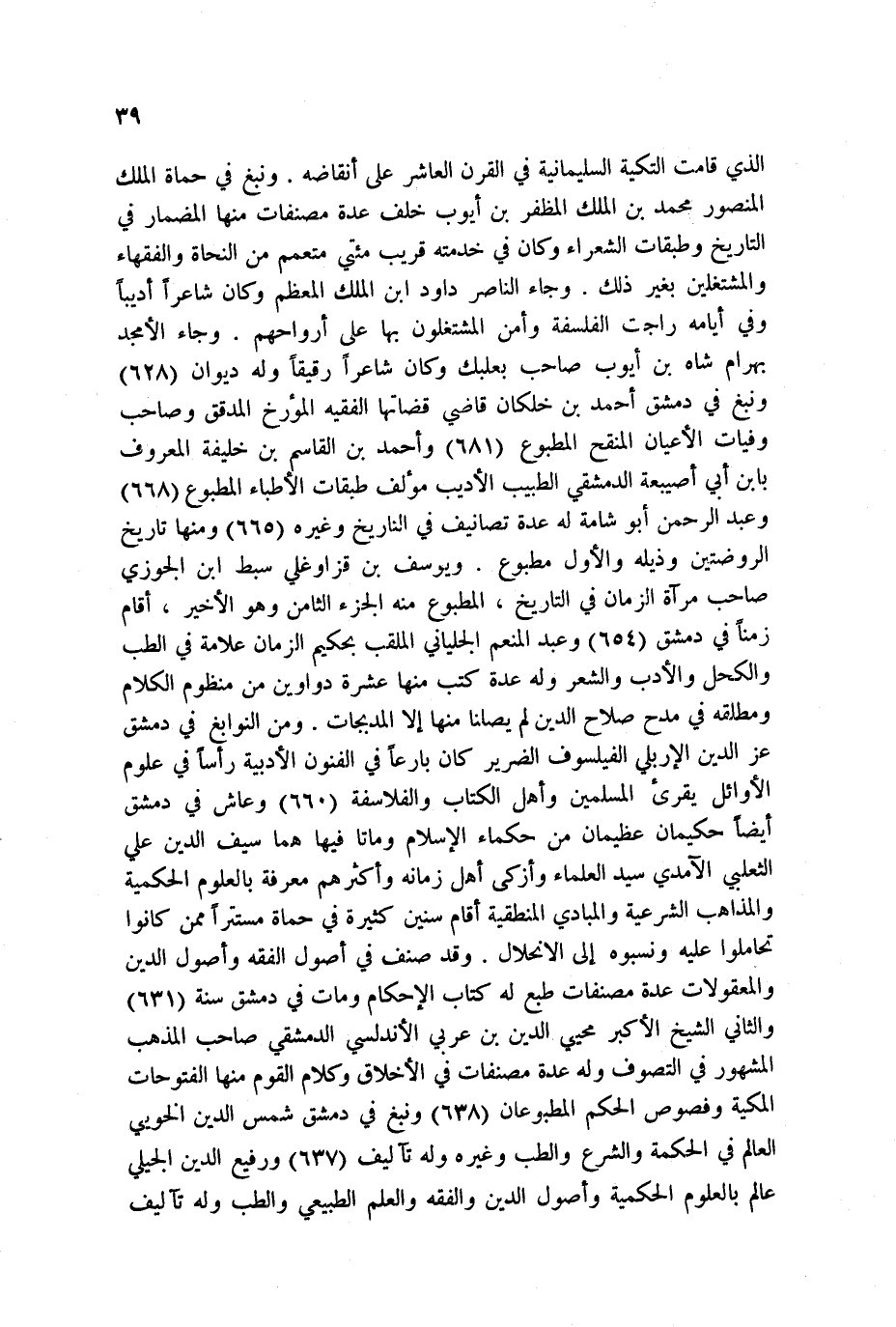 الذي قامت التكية السليمانية في القرن العاشر على أنقاضه. ونبغ في حماة الملك المنصور محمد بن الملك المظفر بن أيوب خلف عدة مصنفات منها المضمار في التاريخ وطبقات الشعراء وكان في خدمته قريب مائتي متعمم من النحاة والفقهاء والمشتغلين بغير ذلك. وجاء الناصر داود ابن الملك المعظم وكان شاعراً أديباً وفي أيامه راجت الفلسفة وأمن المشتغلون بها على أرواحهم. وجاء الأمجد بهرام شاه بن أيوب صاحب بعلبك وكان شاعراً رقيقاً وله ديوان 628 ونبغ في دمشق أحمد بن خلكان قاضي قضاتها الفقيه المؤرخ المدقق وصاحب وفيات الأعيان المنقح المطبوع 681 وأحمد بن القاسم بن خليفة المعروف بابن أبي أصيبعة الدمشقي الطبيب الأديب مؤلف طبقات الأطباء المطبوع 668 وعبد الرحمن أبو شامة له عدة تصانيف في التاريخ وغيره 665 ومنها تاريخ الروضتين وذيله والأول مطبوع. ويوسف بن قزاوغلي سبط ابن الجوزي صاحب مرآة الزمان في التاريخ، المطبوع منه الجزء الثامن وهو الأخير، أقام زمناً في دمشق 654 وعبد المنعم الجلياني الملقب بحكيم الزمان علامة في الطب والكحل والأدب والشعر وله عدة كتب منها عشرة دواوين من منظوم الكلام ومطلقه في مدح صلاح الدين لم يصلنا منها إلا المدبجات. ومن النوابغ في دمشق عز الدين الإربلي الفيلسوف الضرير كان بارعاً في الفنون الأدبية رأساً في علوم الأوائل يقرئ المسلمين وأهل الكتاب والفلاسفة 660 وعاش في دمشق أيضاً حكيمان عظيمان من حكماء الإسلام وماتا فيها هما سيف الدين علي الثعلبي الآمدي سيد العلماء وأزكى أهل زمانه وأكثرهم معرفة بالعلوم الحكمية والمذاهب الشرعية والمبادي المنطقية أقام سنين كثيرة في حماة مستتراً ممن كانوا تحاملوا عليه ونسبوه إلى الانحلال. وقد صنف في أصول الفقه وأصول الدين والمعقولات عدة