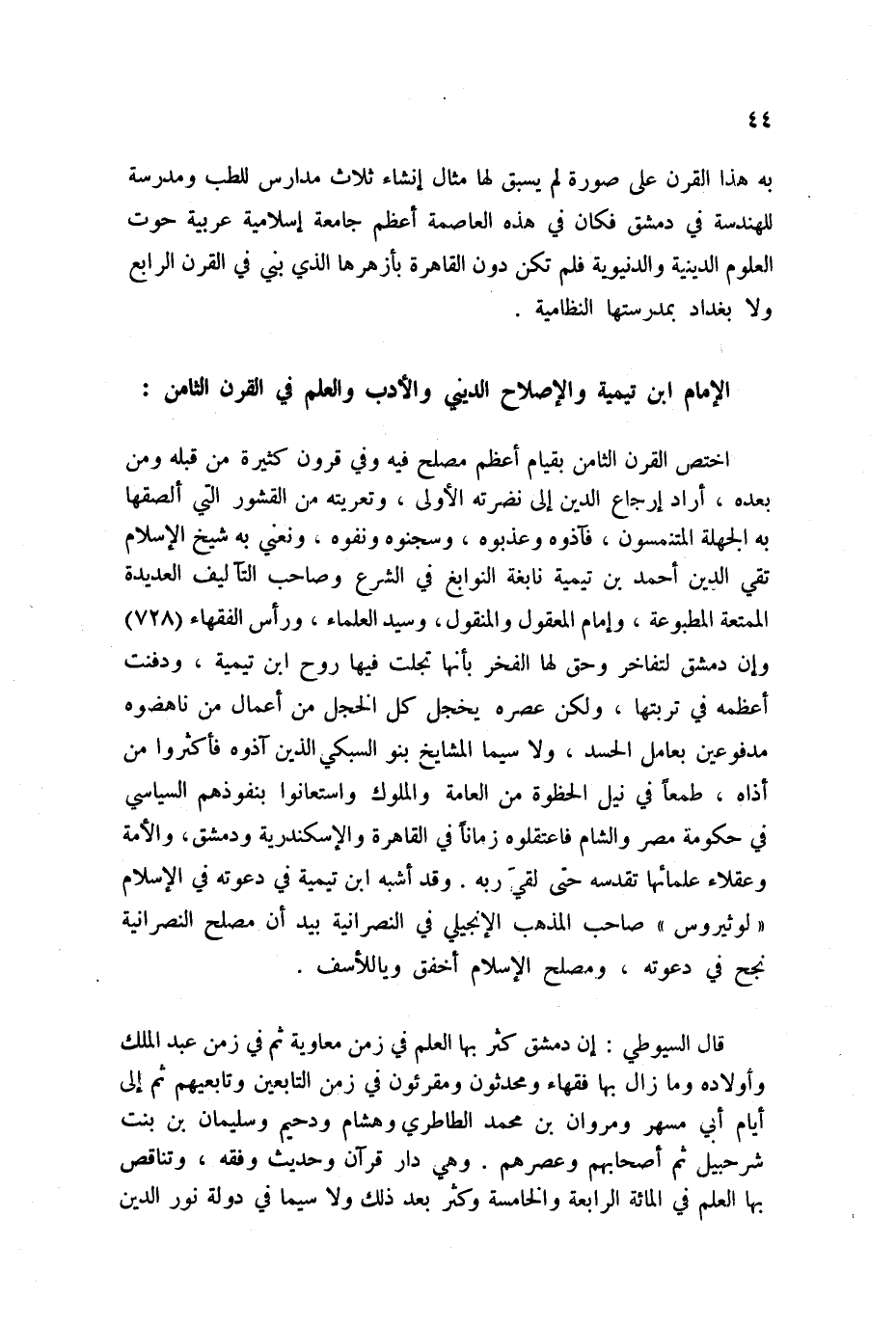 اختص القرن الثامن بقيام أعظم مصلح فيه وفي قرون كثيرة من قبله ومن بعده، أراد إرجاع الدين إلى نضرته الأولى، وتعريته من القشور التي ألصقها به الجهلة المتنمسون، فآذوه وعذبوه، وسجنوه ونفوه، ونعني به شيخ الإسلام تقي الدين أحمد بن تيمية نابغة النوابغ في الشرع وصاحب التآليف العديدة الممتعة المطبوعة، وإمام المعقول والمنقول، وسيد العلماء، ورأس الفقهاء 728 وإن دمشق لتفاخر وحق لها الفخر بأنها تجلت فيها روح ابن تيمية، ودفنت أعظمه في تربتها، ولكن عصره يخجل كل الخجل من أعمال من ناهضوه مدفوعين بعامل الحسد، ولا سيما المشايخ بنو السبكي الذين آذوه فأكثروا من أذاه، طمعاً في نيل الحظوة من العامة والملوك واستعانوا بنفوذهم السياسي في حكومة مصر والشام فاعتقلوه زماناً في القاهرة والإسكندرية ودمشق، والأمة وعقلاء علمائها تقدسه حتى لقي ربه. وقد أشبه ابن تيمية في دعوته في الإسلام لوثيروس صاحب المذهب الإنجيلي في النصرانية بيد أن مصلح النصرانية نجح في دعوته، ومصلح الإسلام أخفق ويا للأسف.