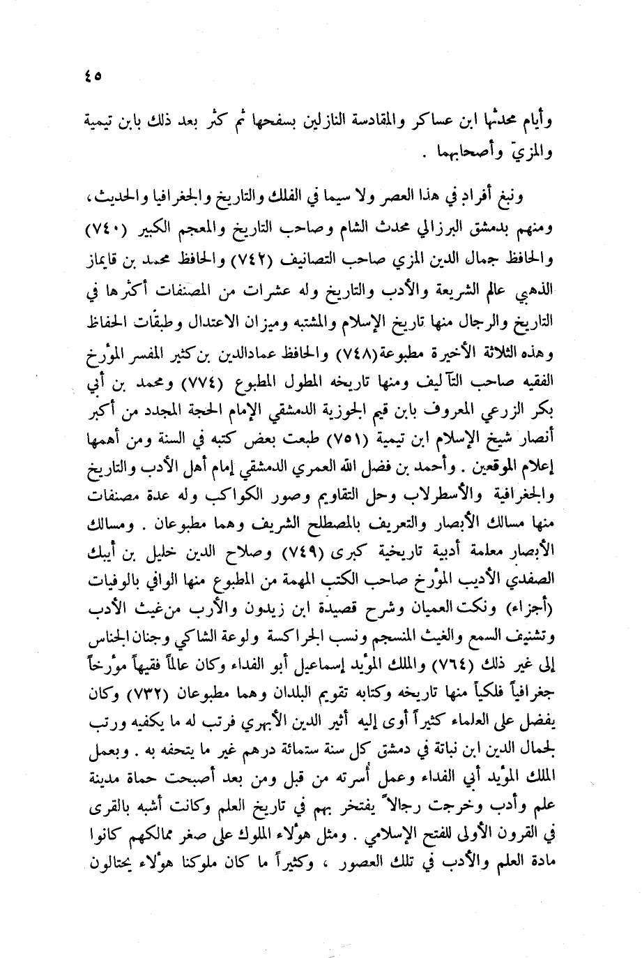 ونبغ أفراد في هذا العصر ولا سيما في الفلك والتاريخ والجغرافيا والحديث، ومنهم بدمشق البرزالي محدث الشام وصاحب التاريخ والمعجم الكبير 740 والحافظ جمال الدين المزي صاحب التصانيف 742 والحافظ محمد بن قايماز الذهبي عالم الشريعة والأدب والتاريخ وله عشرات من المصنفات أكثرها في التاريخ والرجال منها تاريخ الإسلام والمشتبه وميزان الاعتدال وطبقات الحفاظ وهذه الثلاثة الأخيرة مطبوعة 748 والحافظ عماد الدين بن كثير المفسر المؤرخ الفقيه صاحب التآليف ومنها تاريخه المطول المطبوع 774 ومحمد بن أبي بكر الزرعي المعروف بابن قيم الجوزية الدمشقي الإمام الحجة المجدد من أكبر أنصار شيخ الإسلام ابن تيمية 751 طبعت بعض كتبه في السنة ومن أهمها إعلام الموقعين. وأحمد بن فضل الله العمري الدمشقي إمام أهل الأدب والتاريخ والجغرافية والأسطرلاب وحل التقاويم وصور الكواكب وله عدة مصنفات منها مسالك الأبصار والتعريف بالمصطلح الشريف وهما مطبوعان. ومسالك الأبصار معلمة أدبية تاريخية كبرى 749 وصلاح الدين خليل بن أيبك الصفدي الأديب المؤرخ صاحب الكتب المهمة من المطبوع منها الوافي بالوفيات أجزاء ونكت العميان وشرح قصيدة ابن زيدون والأرب من غيث الأدب وتشنيف السمع والغيث المنسجم ونسب الجراكسة ولوعة الشاكي وجنان الجناس إلى غير ذلك 764 والملك المؤيد إسماعيل أبو الفداء وكان عالماً فقيهاً مؤرخاً جغرافياً فلكياً منها تاريخه وكتابه تقويم البلدان وهما مطبوعان 732 وكان يفضل على العلماء كثيراً أوى إليه أثير الدين الأبهري فرتب له ما يكفيه ورتب لجمال الدين ابن نباتة في دمشق كل سنة ستمائة درهم غير ما يتحفه به. وبعمل الملك المؤيد أبي الفداء
