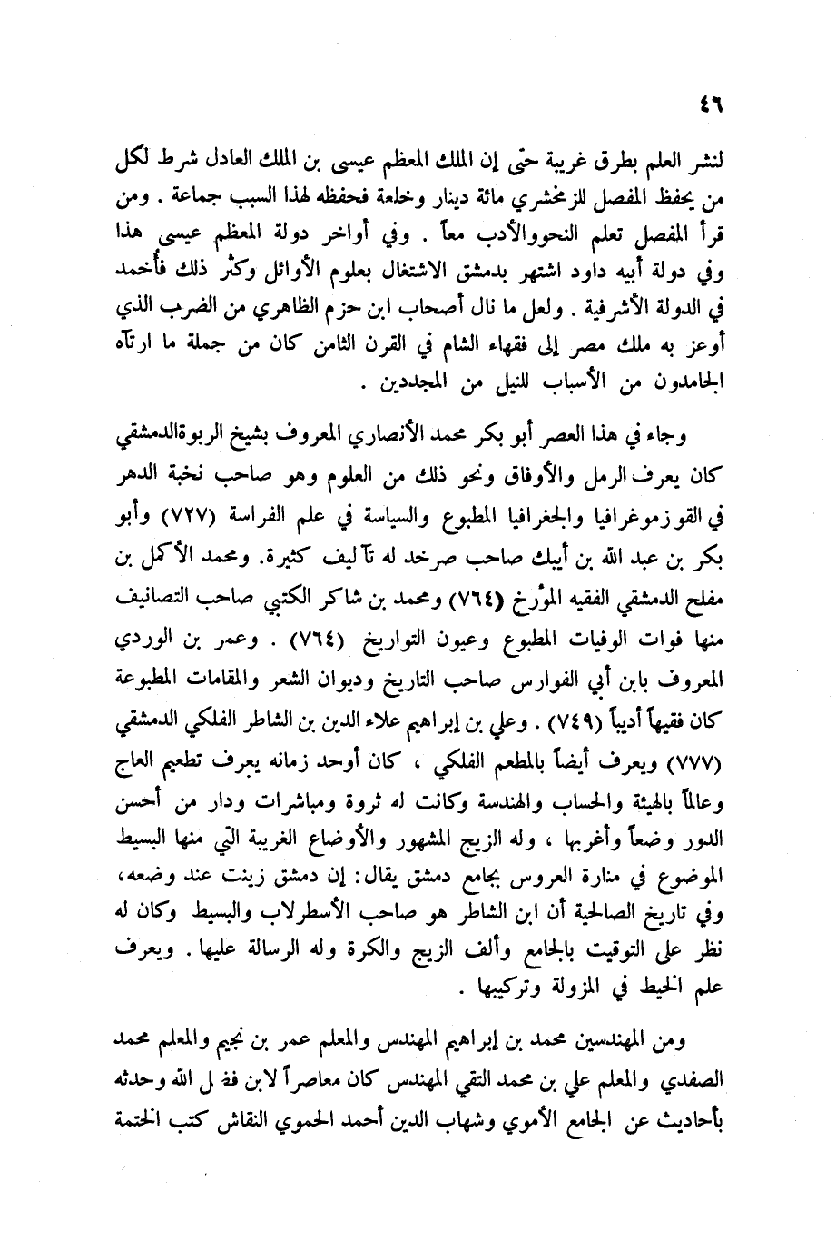 وجاء في هذا العصر أبوبكر محمد الأنصاري المعروف بشيخ الربوة الدمشقي كان يعرف الرمل والأوفاق ونحو ذلك من العلوم وهو صاحب نخبة الدهر في القوزموغرافيا والجغرافيا المطبوع والسياسة في علم الفراسة 727 وأبو بكر بن عبد الله بن أيبك صاحب صرخد له تآليف كثيرة. ومحمد الأكمل بن مفلح الدمشقي الفقيه المؤرخ 764 ومحمد بن شاكر الكتبي صاحب التصانيف منها فوات الوفيات المطبوع وعيون التواريخ 764. وعمر بن الوردي المعروف بابن أبي الفوارس صاحب التاريخ وديوان الشعر والمقامات المطبوعة كان فقيهاً أديباً 749. وعلي بن إبراهيم علاء الدين بن الشاطر الفلكي الدمشقي 777 ويعرف أيضاً بالمطعم الفلكي، كان أوحد زمانه يعرف تطعيم العاج وعالماً بالهيئة والحساب والهندسة وكانت له ثروة ومباشرات ودار من أحسن الدور وضعاً وأغربها، وله الزيج المشهور والأوضاع الغريبة التي منها البسيط الموضوع في منارة العروس بجامع دمشق يقال: إن دمشق زينت عند وضعه، وفي تاريخ