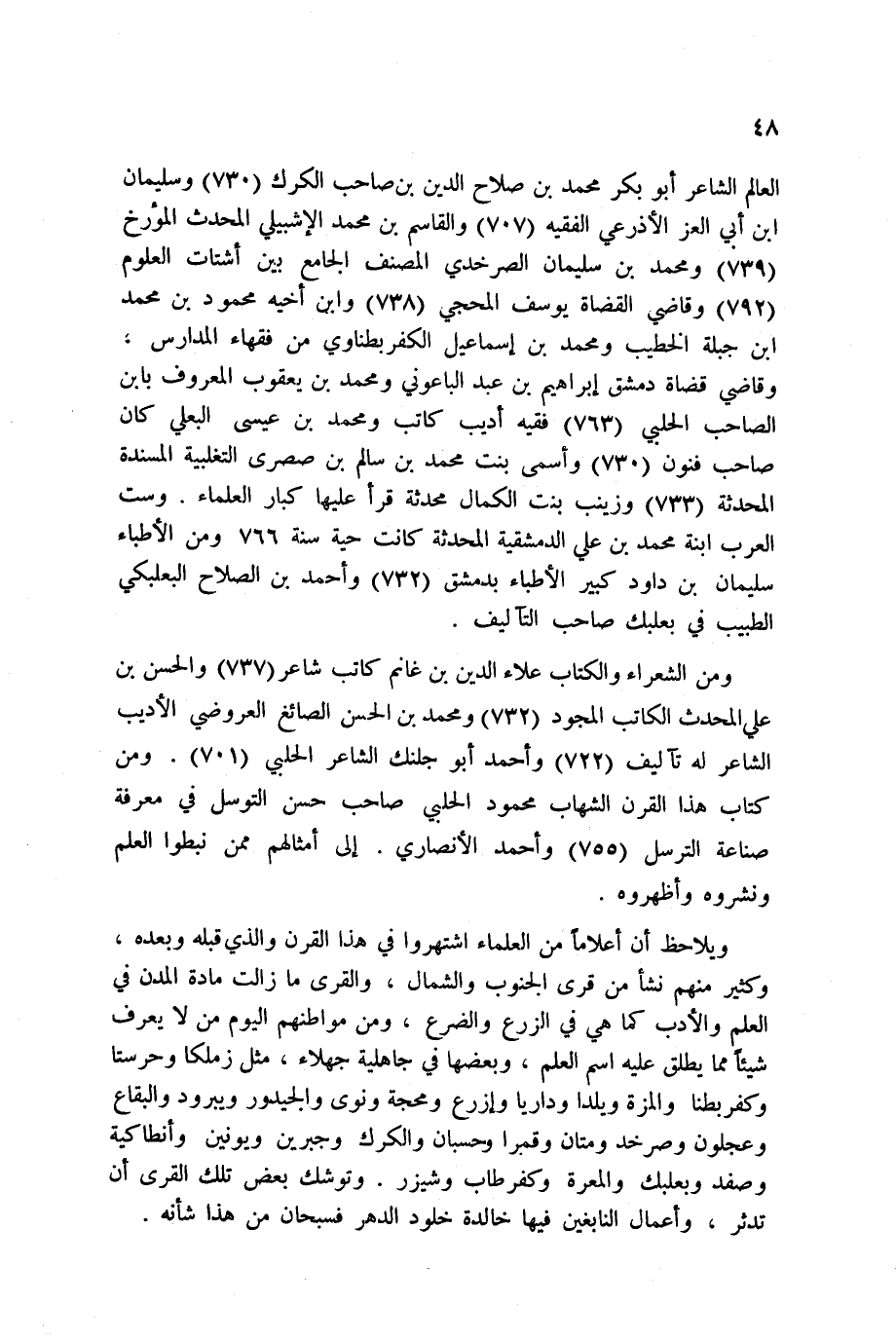 ويلاحظ أن أعلاماً من العلماء اشتهروا في هذا القرن والذي قبله وبعده، وكثير منهم نشأ من قرى الجنوب والشمال، والقرى ما زالت مادة المدن في العلم والأدب كما هي في الزرع والضرع، ومن مواطنهم اليوم من لا يعرف شيئاً مما يطلق علي اسم العلم، وبعضها في جاهلية جهلاء، مثل زملكا وحرستا وكفر بطنا والمزة ويلدا وداريا وإزرع ومحجة ونوى والجيدور ويبرود والبقاع وعجلون وصرخد ومتان وقمرا وحسبان والكرك وجبرين ويونين وإنطاكية وصفد وبعلبك والمعرة وكفرطاب وشيزر. وتوشك بعض تلك القرى أن تدثر، وأعمال النابغين فيها خالدة خلود الدهر فسبحان من هذا شأنه.