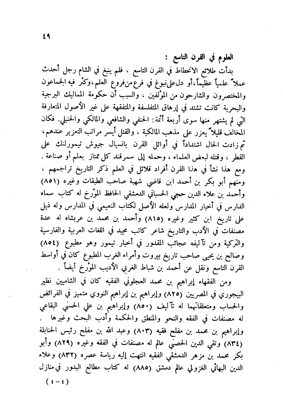 بدأت طلائع الانحطاط في القرن التاسع، فلم ينبغ في الشام رجل أحدث عملاً علمياً عظيماً، أو دل على نبوغ في فرع من فروع العلم، وكثر في الجماعون والمختصرون والشارحون من المؤلفين، والسبب أن حكومة المماليك البرجية والبحرية كانت تشتد في إرهاق المتفلسفة والمتفقهة على غير الأصول المتعارفة التي لم يشتهر منها سوى أربعة أئمة: الحنفي والشافعي والمالكي والحنبلي. فكان المخلف قليلاً يعزر على مذهب المالكية، والقتل أيسر مراتب التعزير عندهم، ثم زادت الحال اشتداداً في أوائل القرن بانسيال جيوش تيمورلنك على القطر، وقتله لبعض العلماء، وحمله إلى سمر قند كل ممتاز بعلم أو صناعة. ومع هذا نشأ في هذا القرن أفراد قلائل في العلم ذكر التاريخ تراجمهم، ومنهم أبو بكر بن أحمد ابن قاضي شهبة صاحب الطبقات وغيره 851 وأحمد بن علاء الدين حجي الحسباني الدمشقي الحافظ المؤرخ له كتاب سماه الدارس في أخبار المدارس ولعله الأصل لكتاب النعيمي في المارس وله ذيل على تاريخ ابن كثير وغيره 815 وأحمد بن محمد بن عربشاه له عدة مصنفات في الأدب والتاريخ شاعر كاتب مجيد في اللغات العربية والفارسية والتركية ومن تآليفه عجائب المقدور في أخبار تيمور وهو مطبوع 854 وصالح بن يحيى صاحب تاريخ بيروت وأمراء الغرب المطبوع كان في أواسط القرن التاسع ونقل عن أحمد بن شباط الغربي الأديب والمؤرخ أيضاً. ومن الفقهاء إبراهيم بن محمد العجلوني الفقيه كان في الشميين نظير البيجوري في المصريين 825 وإبراهيم بن إبراهيم النووي متميز في الفرائض والحساب ومتعلقاتهما له تآليف 850 وإبراهيم بن علي الحسني البقاعي له مصنفات في الفقه والنحو والمنطق والحكمة وأدب البحث وغيرها. وإبراهيم بن محمد بن مفلح فقيه 803 وعبد الله بن مفلح رئيس الحنابلة 834 وتقي الدين الحصني عالم له مصنفات في الفقه وغيره 829 وأبو بكر محمد بن مزهر