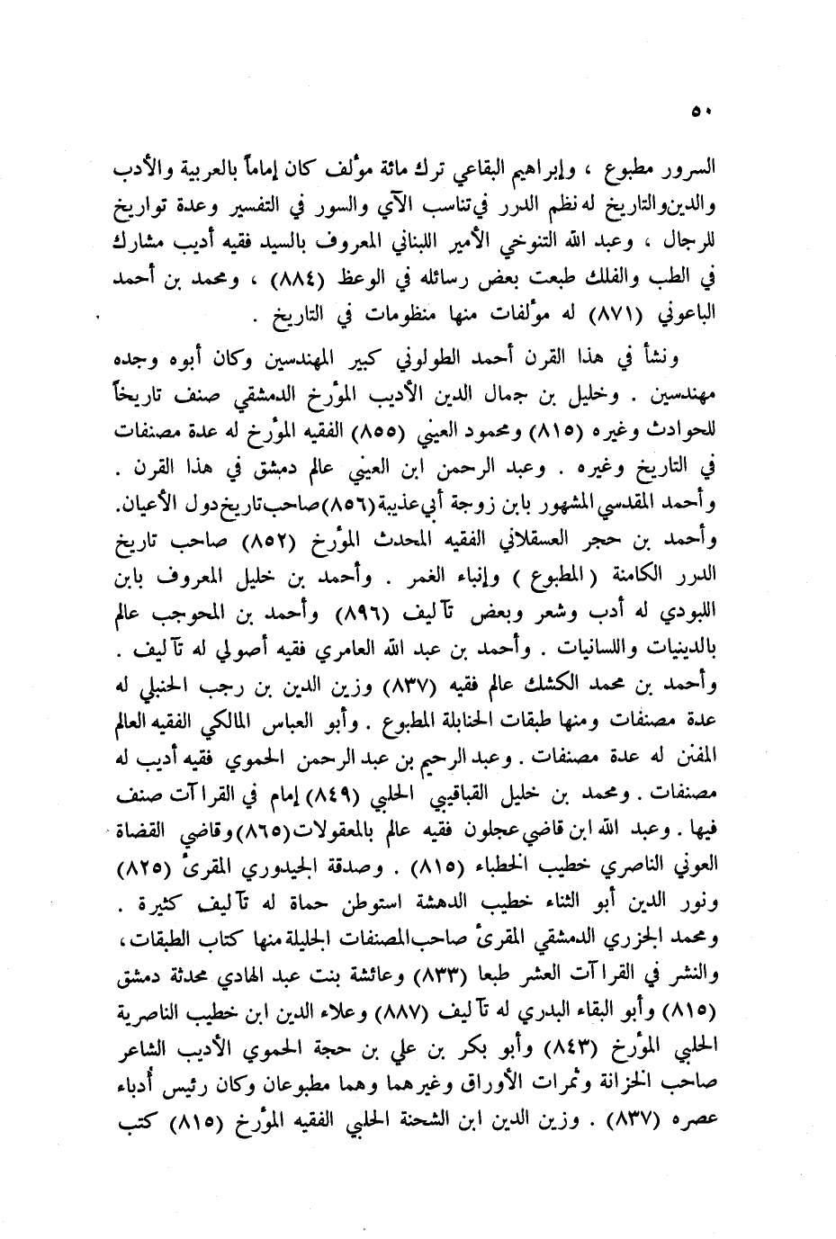 السرور مطبوع، وإبراهيم البقاعي ترك مائة مؤلف كان إماماً بالعربية والأدب والدين والتاريخ له نظم الدرر في تناسب الآي والسور في التفسير وعدة تواريخ للرجال، وعبد الله التنوخي الأمير اللبناني المعروف بالسيد فقيه أديب مشارك في الطب والفلك طبعت بعض رسائله في الوعظ 884، ومحمد بن أحمد الباعوني 871 له مؤلفات منها منظومات في التاريخ.