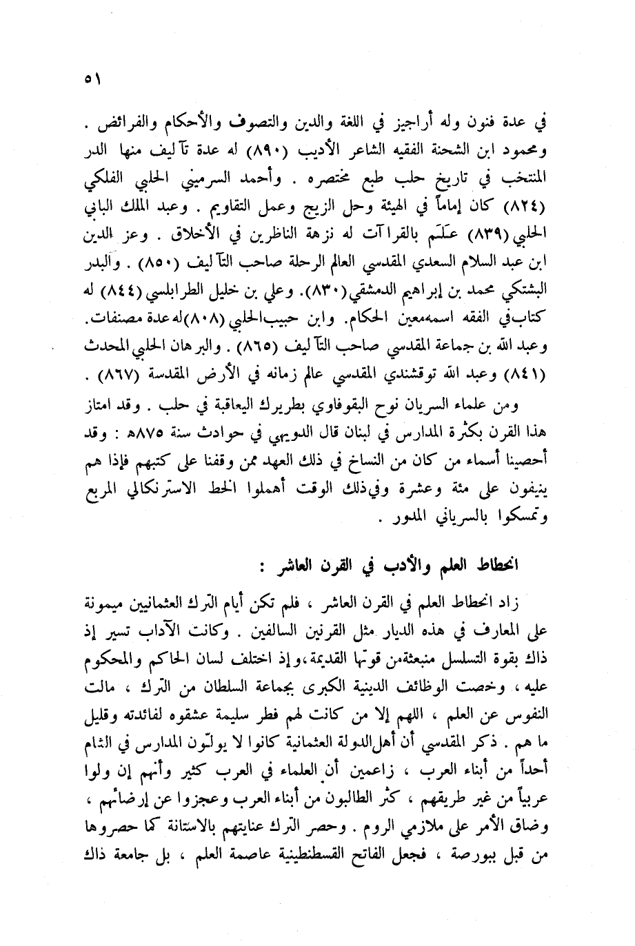 المعارف في هذه الديار مثل القرنين السالفين. وكانت الآداب تسير إذ ذاك بقوة التسلسل منبعثة من قوتها القديمة، وإذ اختلف لسان الحاكم والمحكوم عليه، وخصت الوظائف الدينية الكبرى بجماعة السلطان من الترك، مالت النفوس عن العلم، اللهم إلا من كانت لهم فطر سليمة عشقوه لفائدته وقليل ما هم. ذكر المقدسي أن أهل الدولة العثمانية كانوا لا يولّون المدارس في الشام أحداً من أبناء العرب، زاعمين أن العلماء في العرب كثير وأنهم إن ولوا عربياً من غير طريقهم، كثر الطالبون من أبناء العرب وعجزوا عن إرضائهم، وضاق الأمر على ملازمي الروم. وحصر الترك عنايتهم بالآستانة كما حصروها من قبل ببورصة، فجعل الفاتح القسطنطينية عاصمة العلم، بل جامعة ذاك