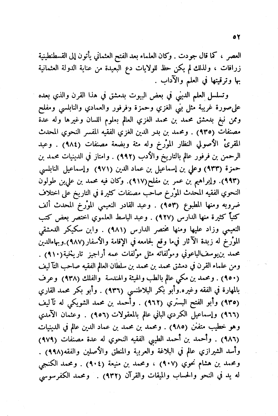 العصر، كما قال جودت. وكان العلماء بعد الفتح العثماني يأتون إلى القسطنطينية زرافات، ولذلك لم يكن حظ للولايات دع البعيدة من عناية الدولة العثمانية بها وترقيتها في العلم والآداب. وتسلسل العلم الديني في بعض البيوت بدمشق في هذا القرن والذي بعده على صورة غريبة مثل بني الغزي وحمزة وفرفور والعمادي والنابلسي ومفلح وممن نبغ بدمشق محمد بن محمد الغزي العالم بعلوم اللسان وغيرها وله عدة مصنفات 935. ومحمد بن بدر الدين الغزي الفقيه المفسر النحوي المحدث المقرئ الأصولي النظار المؤرخ وله مائة وبضعة مصنفات 984؟ وعبد الرحمن بن فرفور عالم بالتاريخ والأدب 992. وامتاز بالدينيات محمد بن حمزة 933 وعلي بن إسماعيل بن عماد الدين 971 وإسماعيل النابلسي 993. وإبراهيم بن عمر بن مفلح 917. وكان فيه محمد بن علي بن طولون النحوي الفقيه المحدث المؤرخ صاحب مصنفات كثيرة في التاريخ على اختلاف ضروبه ومنها المطبوع 953. وعبد القادر النعيمي المؤرخ المحدث ألف كتباً كثيرة منها الدارس 927. وعبد الباسط العلموي اختصر بعض كتب النعيمي وزاد عليها ومنها مختصر الدارس