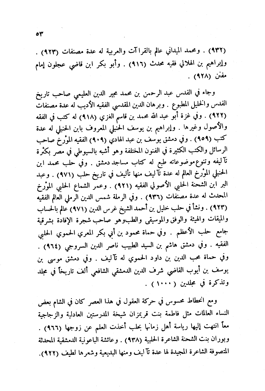 الحلبي الأصولي الفقيه 921. وعمر الشماع الحلبي المؤرخ المحدث له عدة مصنفات 936. وفي الرملة شمس الدين الرملي العالم الفقيه 923. ونشأ في حلب خليل بن أحمد الشيخ غرس الدين 971 عالم بالحساب والميقات والهيئة والوفق والموسيقى والطب وهو صاحب شجرة الإفادة بشرقية جامع حلب الأعظم. وفي حماة محمود بن أبي بكر المعري الحموي الحلبي الفقيه. وفي دمشق هاشم بن السيد الطبيب ناصر الدين السروجي 964. وفي حماة محب الدين بن داود الحموي له تآليف. وفي دمشق موسى بن يوسف بن أيوب القاضي شرف الدين الدمشقي الشافعي ألف تاريخاً في مجلد وتذكرة في مجلدين 1000.