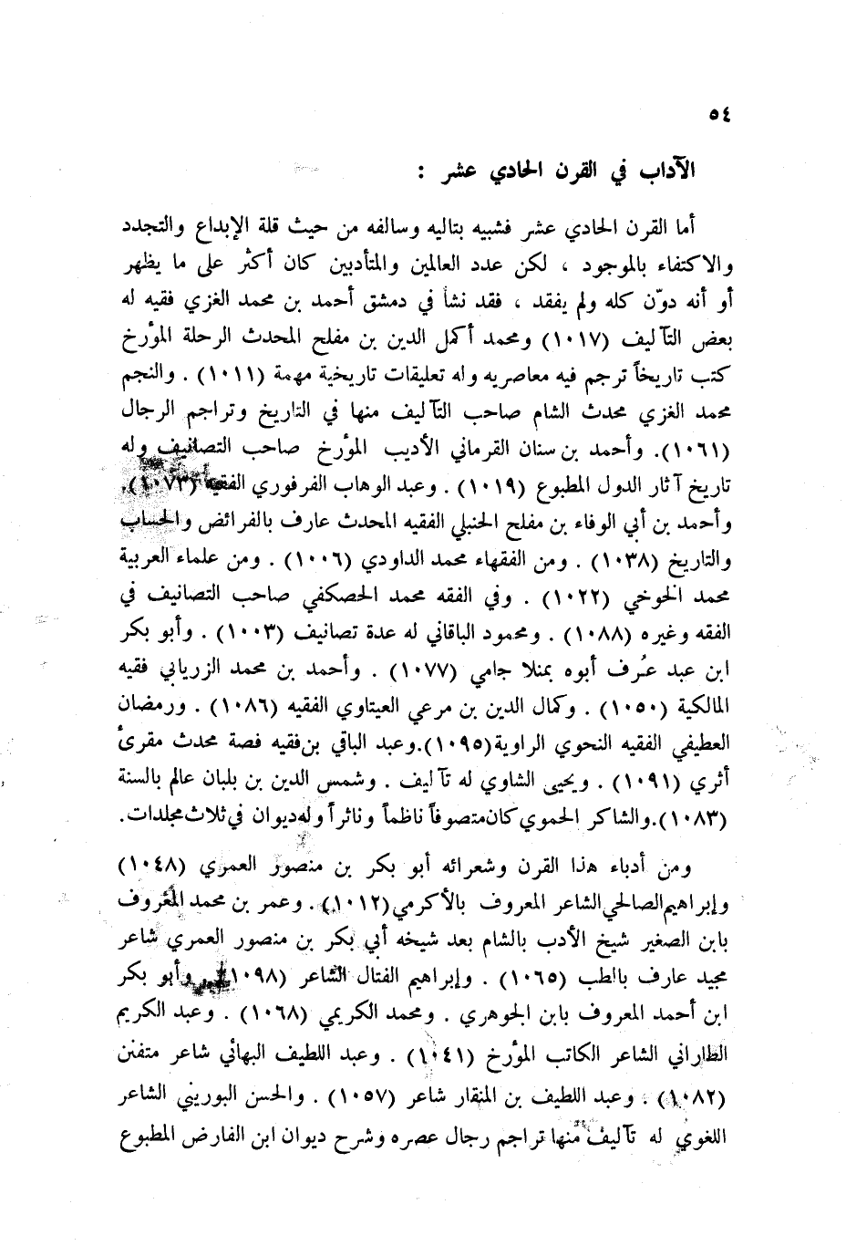 أما القرن الحادي عشر فشبيه بتاليه وسالفه من حيث قلة الإبداع والتجدد والاكتفاء بالموجود، لكن عدد العالمين والمتأدبين كان أكثر على ما يظهر أو أنه دوّن كله ولم يفقد، فقد نشأ في دمشق أحمد بن محمد الغزي فقيه له بعض التآليف 1017 ومحمد أكمل الدين بن مفلح المحدث الرحلة المؤرخ كتب تاريخاً ترجم فيه معاصريه وله تعليقات تاريخية مهمة 1011. والنجم محمد الغزي محدث الشام صاحب التآليف منها في التاريخ وتراجم الرجال 1061. وأحمد بن سنان القرماني الأديب المؤرخ صاحب التصانيف وله تاريخ آثار الدول المطبوع 1019. وعبد الوهاب الفرفوري الفقيه 1073. وأحمد بن أبي الوفاء بن مفلح
