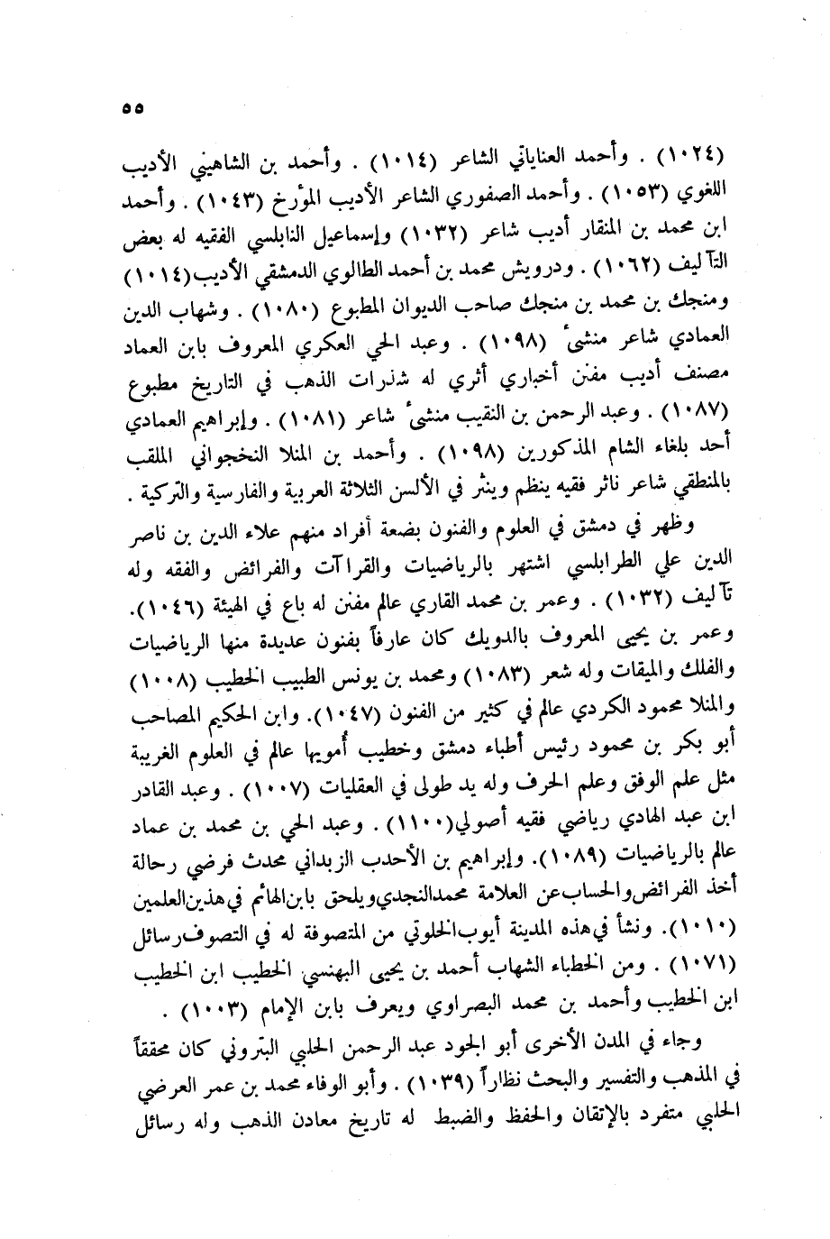 المعروف بابن العماد مصنف أديب مفنن أخباري أثري له شذرات الذهب في التاريخ المطبوع 1087. وعبد الرحمن بن النقيب منش شاعر 1081. وإبراهيم العمادي أحد بلغاء الشام المذكورين 1098. وأحمد بن المنلا النخجواني الملقب بالمنطقي شاعر ناثر فقيه ينظم وينثر في الألسن الثلاثة العربية والفارسية والتركية. وظهر في دمشق في العلوم والفنون بضعة أفراد منهم علاء الدين بن ناصر الدين علي الطرابلسي اشتهر بالرياضيات والقراآت والفرائض والفقه وله تآليف 1032. وعمر بن محمد القاري عالم مفنن له باع في الهيئة 1046. وعمر بن يحيى المعروف بالدويك كان عارفاً بفنون عديدة منها الرياضيات والفلك والميقات وله شعر 1083 ومحمد بن يونس الطبيب الخطيب 1008 والمنلا محمود الكردي عالم في كثير من الفنون 1047. وابن الحكيم المصاحب أبو بكر بن محمود رئيس أطباء دمشق وخطيب أُمويها عالم في العلوم الغريبة مثل علم الوفق وعلم الحرف وله يد طولى في العقليات 1007. وعبد القادر ابن عبد الهادي رياضي فقيه أصولي 1100. وعبد الحي بن محمد بن عماد عالم بالرياضيات 1089. وإبراهيم بن الأحدب الزبداني محدث فرضي رحالة أخذ الفرائض والحساب عن العلامة محمد النجدي ويلحق بابن الهائم في هذين العلمين 1010. ونشأ في هذه المدينة أيوب الخلوتي من المتصوفة له في التصوف رسائل 1071. ومن الخطباء الشهاب أحمد بن يحيى البهنسي الخطيب ابن الخطيب ابن الخطيب وأحمد بن محمد البصراوي ويعرف بابن الإمام 1003.
