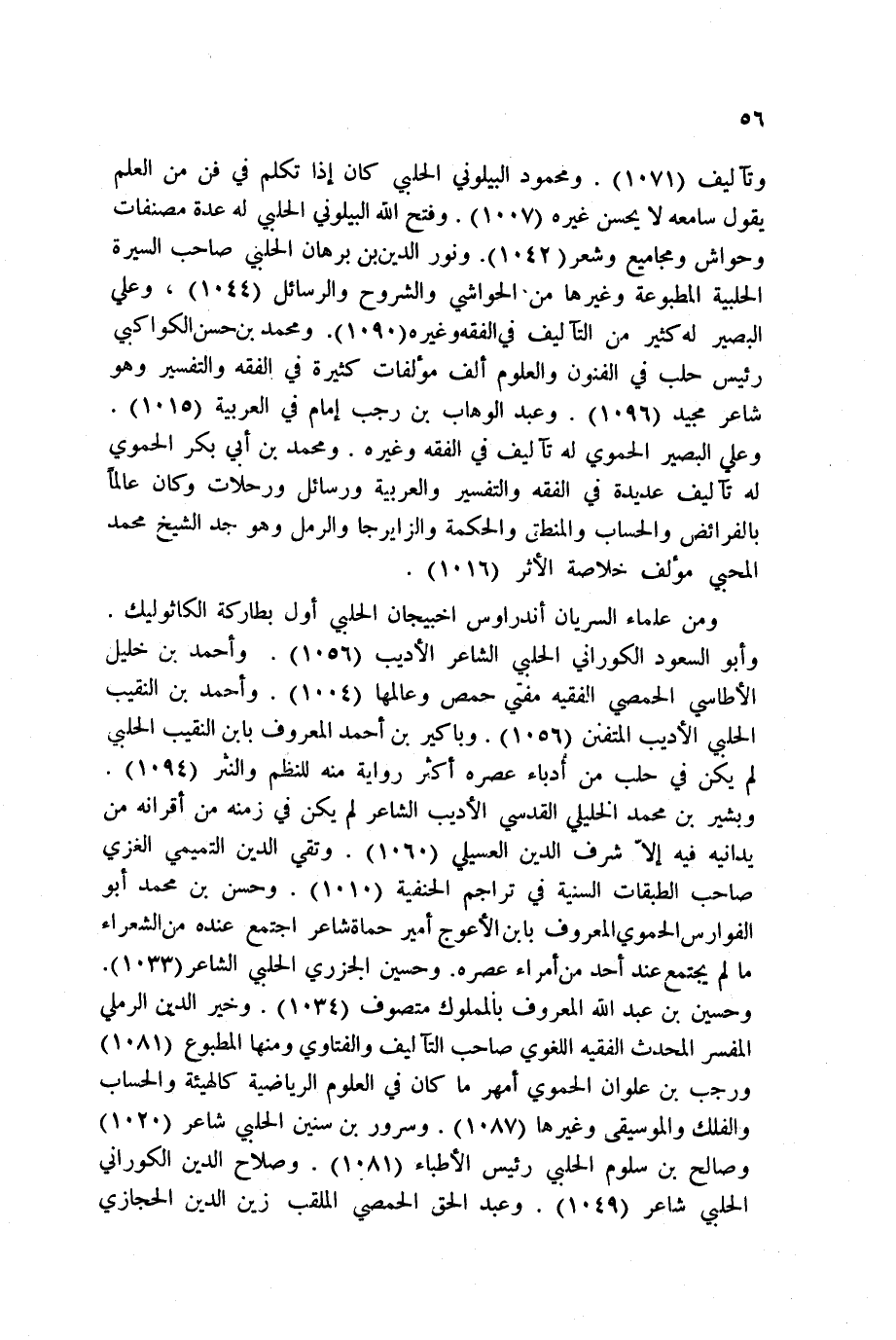 يحسن غيره 1007. وفتح الله البيلوني الحلبي له عدة مصنفات وحواش ومجاميع وشعر 1042. ونور الدين بن برهان الحلبي صاحب السيرة الحلبية المطبوعة وغيرها من الحواشي والشروح والرسائل 1044، وعلي البصير له كثير من التآليف في الفقه وغيره 1090. ومحمد بن حسن الكواكبي رئيس حلب في الفنون والعلوم ألف مؤلفات كثيرة في الفقه والتفسير وهو شاعر مجيد 1096. وعبد الوهاب بن رجب أمام في العربية 1015. وعلي البصير الحموي له تآليف في الفقه وغيره. ومحمد بن أبي بكر الحموي له تآليف عديدة في الفقه والتفسير والعربية ورسائل ورحلات وكان عالماً بالفرائض والحساب والمنطق والحكمة والزايرجا والرمل وهوجد الشيخ محمد المحبي مؤلف خلاصة الأثر 1016.