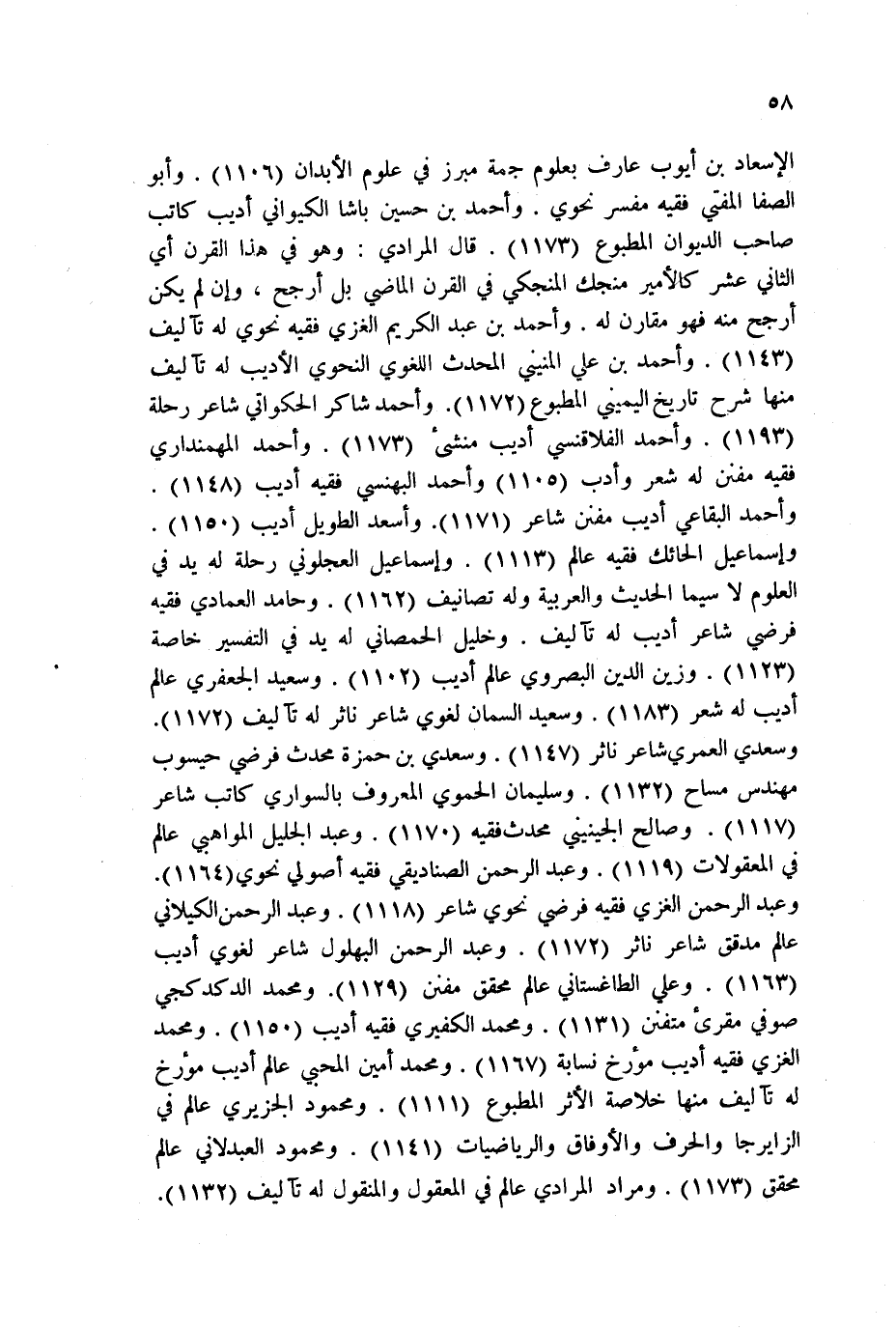 بن أيوب عارف بعلوم جمة مبرز في علوم الأبدان 1106. وأبو الصفا المفتي فقيه مفسر نحوي. وأحمد بن حسين باشا الكيواني أديب كاتب صاحب الديوان المطبوع 1173. قال المرادي: وهو في هذا القرن أي الثاني عشر كالأمير منجك في القرن الماضي بل أرجح، وإن لم يكن أرجح منه فهو مقارن له. وأحمد بن عبد الكريم الغزي فقيه نحوي له تآليف 1143. وأحمد بن علي المنيني المحدث اللغوي النحوي الأديب له تآليف منها شرح تاريخ اليميني المطبوع 1172. وأحمد شاكر الحكواتي شاعر رحلة 1193. وأحمد الفلاقنسي أديب منشئ 1173. وأحمد المهمنداري فقيه مفنن له شعر وأدب 1105 وأحمد البهنسي فقيه أديب 1148. وأحمد البقاعي أديب مفنن شاعر 1171. وأسعد الطويل أديب 1150. وإسماعيل الحائك فقيه عالم 1113. وإسماعيل العجلوني رحلة له يد في العلوم لا سيما الحديث والعربية وله تصانيف 1162. وحامد العمادي فقيه فرضي شاعر أديب له تآليف. وخليل الحمصاني له يد في التفسير خاصة 1123. وزين الدين البصروي عالم أديب 1102. وسعيد الجعفري عالم أديب له شعر 1183. وسعيد السمان لغوي شاعر ناثر له تآليف 1172. وسعدي العمري شاعر ناثر 1147. وسعدي بن حمزة محدث فرضي حيسوب مهندس مساح 1132. وسليمان الحموي المعروف بالسواري كاتب شاعر 1117 وصالح الجينيني محدث فقيه 1170. وعبد الجليل