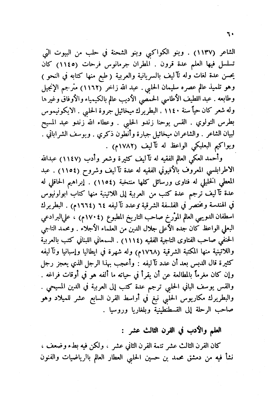 الشاعر 1137. وبنو الكواكبي وبنو الشحنة في حلب من البيوت التي تسلسل فيها العلم عدة قرون. المطران جرمانوس فرحات 1145 كان يحسن عدة لغات وله تآليف بالسريانية والعربية طبع منها كتابه في النحو وهو تلميذ عالم عصره سليمان الحلبي. عبد الله زاخر 1162 مترجم الإنجيل وطابعه. عبد اللطيف الأطاسي الحمصي الأديب عالم بالكيمياء والأوفاق وغيرها وله شعر كان حياً سنة 1140. البطريرك ميخائيل جروة الحلبي. الايكونيموس بطرس التولوي. القس يوحنا زندو الحلبي. وعطاء الله زندو عبد المسيح لبيان الشاعر. والشاعران ميخائيل جبارة وأنطون ذكري. ويوسف الشراباتي. ويواكيم البعلبكي الواعظ له تآليف 1782م.