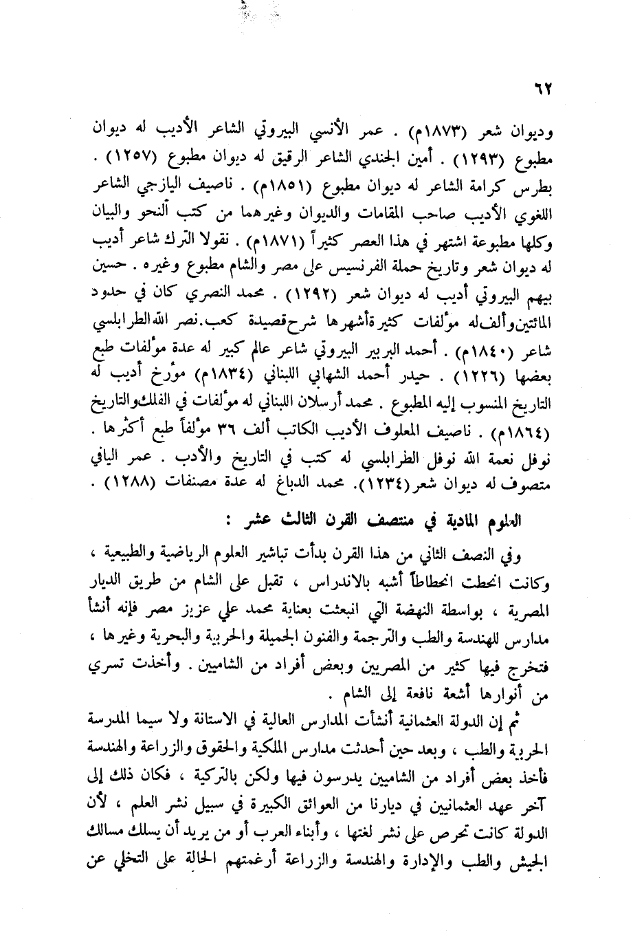 الترك شاعر أديب له ديوان شعر وتاريخ حملة الفرنسيس على مصر والشام مطبوع وغيره. حسين بيهم البيروتي أديب له ديوان شعر 1292. محمد النصري كان في حدود المائتين وألف له مؤلفات كثيرة أشهرها شرح قصيدة كعب. نصر الله الطرابلسي شاعر 1840م. لأحمد البربير البيروتي شاعر عالم كبير له عدة مؤلفات طبع بعضها 1226. حيدر أحمد الشهابي اللبناني 1834م مؤرخ أديب له التاريخ المنسوب إليه المطبوع. محمد أرسلان اللبناني له مؤلفات في الفلك والتاريخ 1864م. ناصيف المعلوف الأديب الكاتب ألف 36 مؤلفاً طبع أكثرها. نوفل نعمة الله نوفل الطرابلسي له كتب في التاريخ والأدب. عمر اليافي متصوف له ديوان شعر 1234. محمد الدباغ له عدة مصنفات 1288.
