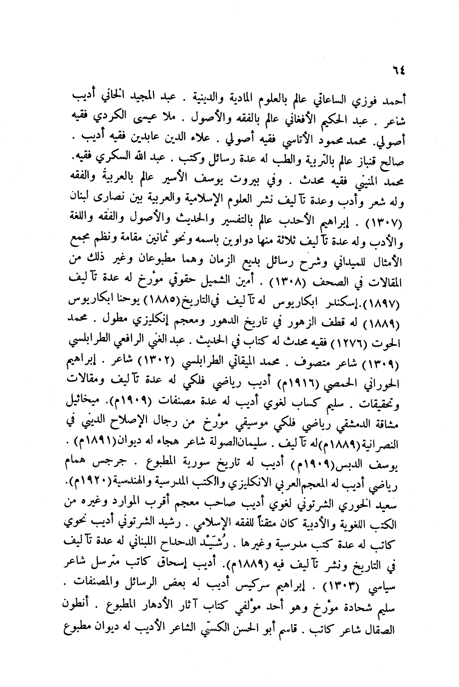 أحمد فوزي الساعاتي عالم بالعلوم المادية والدينية. عبد المجيد الخاني أديب شاعر. عبد الحكيم الأفغاني عالم بالفقه والأصول. ملا عيسى الكردي فقيه أصولي. محمد محمود الأتاسي فقيه أصولي. علاء الدين عابدين فقيه أديب. صالح قنباز عالم بالتربية والطب له عدة رسائل وكتب. عبد الله السكري فقيه. محمد المنيني فقيه محدث. وفي بيروت يوسف الأسير عالم بالعربية والفقه وله شعر وأدب وعدة تآليف نشر العلوم الإسلامية والعربية بين نصارى لبنان 1307. إبراهيم الأحدب عالم بالتفسير والحديث والأصول والفقه واللغة والأدب وله عدة تآليف ثلاثة منها دواوين باسمه ونحو ثمانين مقامة ونظم مجمع الأمثال للميداني وشرح رسائل بديع الزمان وهما مطبوعان وغير ذلك من المقالات في الصحف 1308. أمين الشميل حقوقي مؤرخ له عدة تآليف 1897. إسكندر ابكاريوس له تآليف في التاريخ 1885 يوحنا ابكاريوس 1889 له قطف الزهور في تاريخ الدهور ومعجم إنكليزي مطول. محمد الحوت 1276 فقيه محدث له كتاب في الحديث. عبد الغني الرافعي الطرابلسي 1309 شاعر متصوف. محمد الميقاتي الطرابلسي 1302