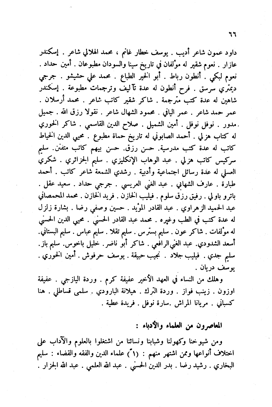 ومن شيوخنا وكهولنا وشبابنا ونسائنا من اشتغلوا بالعلوم والآداب على اختلاف أنواعها وممن اشتهر منهم: 1ً علماء الدين والفقه والقضاء: سليم البخاري. رشيد رضا. بدر الدين الحسني. عبد الله العلمي. عبد الله الجزار.