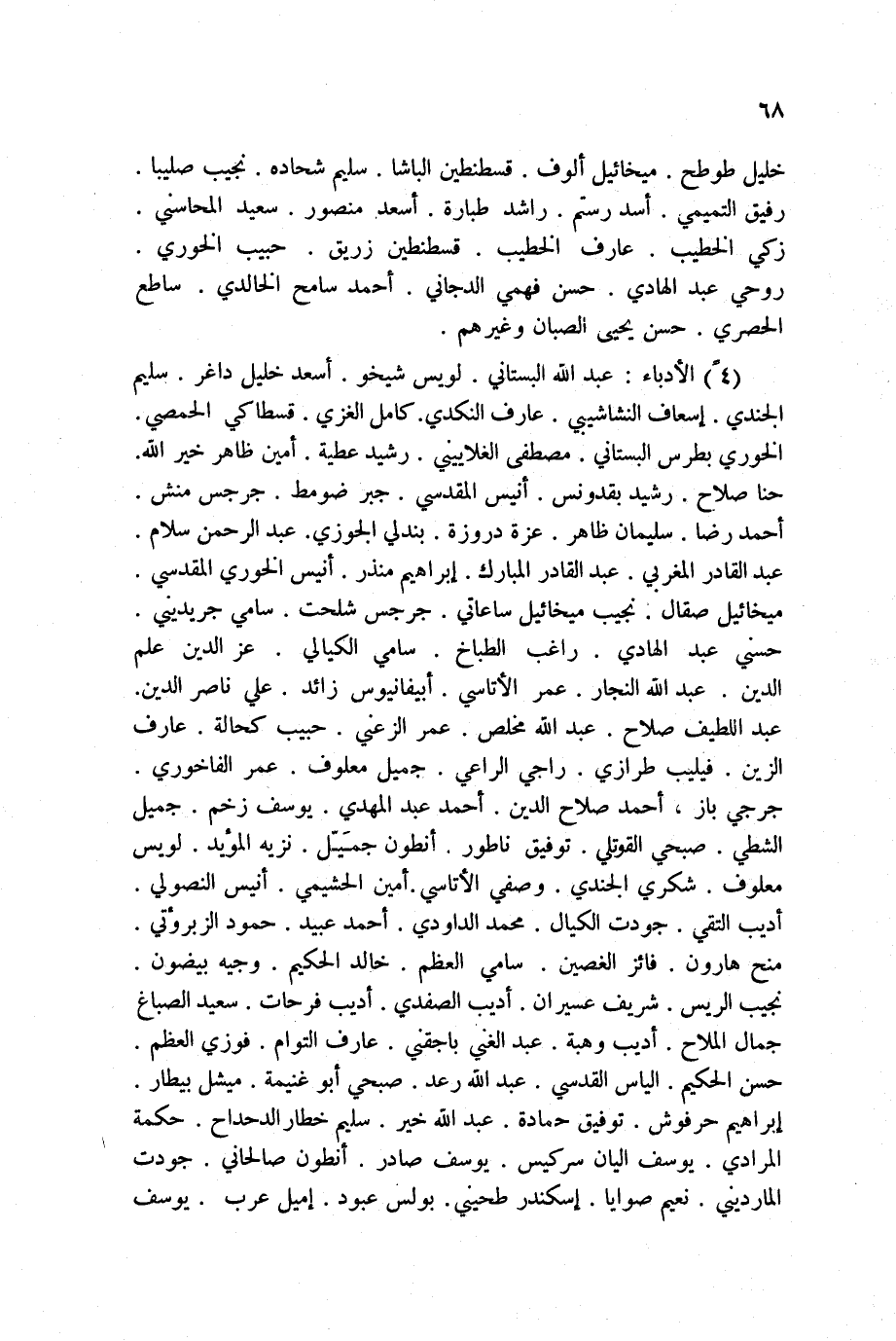 4ً الأدباء: عبد الله البستاني. لويس شيخو. أسعد خليل داغر. سليم الجندي. إسعاف النشاشيبي. عارف النكدي. كامل الغزي. قسطاكي الحمصي. الخوري بطرس البستاني. مصطفى الغلاييني. رشيد عطية. أمين ظاهر خير الله. حنا صلاح. رشيد بقدونس. أنيس المقدسي. جبر ضومط. جرجس منش. أحمد رضا. سليمان ظاهر. عزة دروزة. بندلي الجوزي. عبد الرحمن سلام. عبد القادر المغربي. عبد القادر المبارك. إبراهيم منذر. أنيس الخوري المقدسي. ميخائيل صقال. نجيب ميخائيل ساعاتي. جرجس شلحت. سامي جريديني. حسني عبد الهادي. راغب الطباخ. سامي الكيالي. عز الدين علم الدين. عبد الله النجار. عمر الأتاسي. أبيفانيوس زائد. علي ناصر الدين. عبد اللطيف صلاح. عبد الله مخلص. عمر الزعني. حبيب كحالة. عارف الزين. فيليب طرازي. راجي الراعي. جميل معلوف. عمر الفاخوري. جرجي باز. أحمد صلاح الدين. أحمد عبد المهدي. يوسف زخم. جميل الشطي. صبحي القوتلي. توفيق ناطور. أنطون جمَيّل. نزيه المؤيد. لويس معلوف. شكري الجندي. وصفي الأتاسي. أمين الحشيمي. أنيس النصولي. أديب التقي. جودت الكيال. محمد الداودي. أحمد عبيد. حمود الزبرؤتي. منح هارون. فائز الغصين. سامي العظم. خالد الحكيم. وجيه بيضون. نجيب الريس. شريف عسيران. أديب الصفدي. أديب فرحات. سعيد الصباغ. جمال الملاح. أديب وهبة. عبد الغني باجقني. عارف التوام. فوزي العظم. حسن الحكيم. الياس القدسي. عبد الله رعد. صبحي أبو غنيمة. ميشيل بيطار. إبراهيم حرفوش. توفيق حمادة. عبد الله خير. سليم خطار الدحداح. حكمة المرادي. يوسف اليان سركيس. يوسف صادر. أنطون صالحاني. جودت